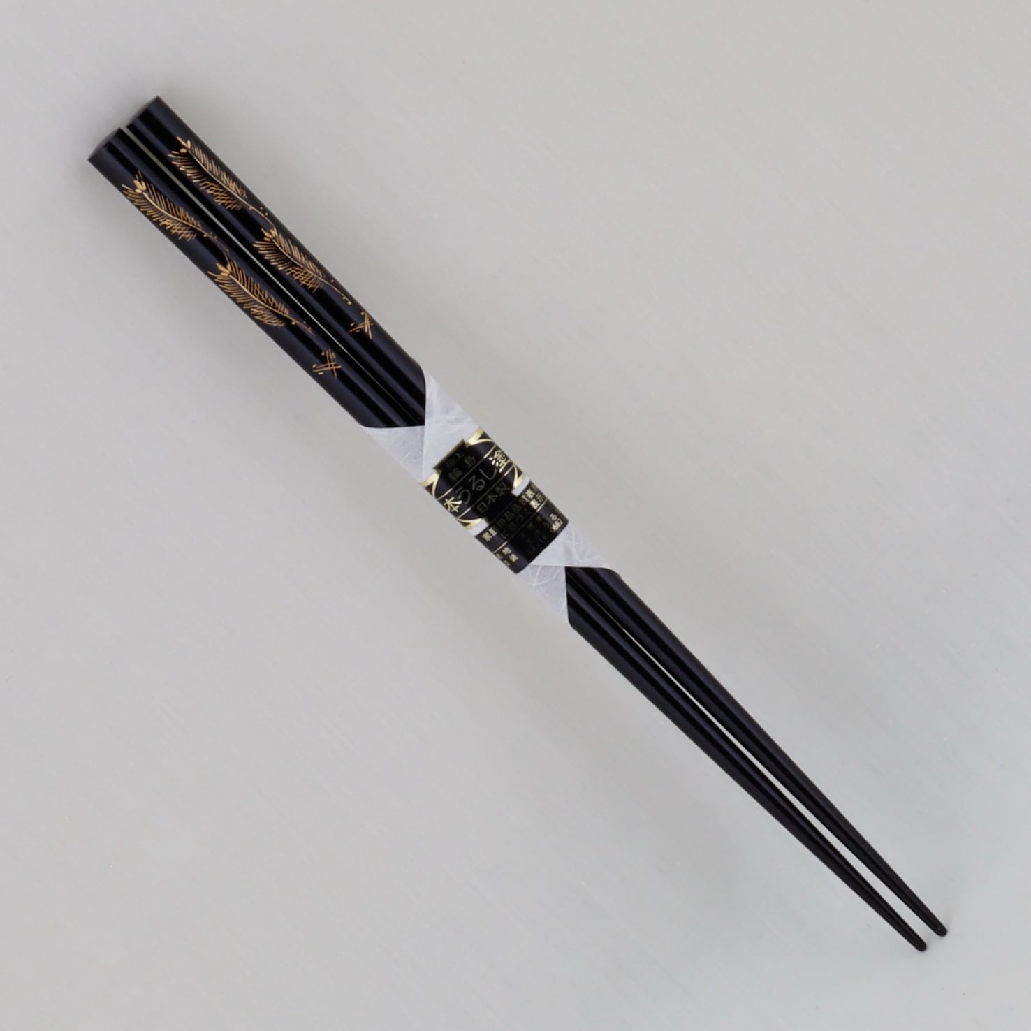 この箸は、熟練した職人の手による、黒塗り仕上げと若松沈金の華やかさが特徴です。一つ一つ丁寧に沈金鑿で彫り上げられた箸は、使用するたびにその魅力が増し、日常の食事を特別な体験へと昇華させてくれます。 お料理の色合いや盛り付けを美しく引き立て、日々の食卓に和のテイストを添えます。