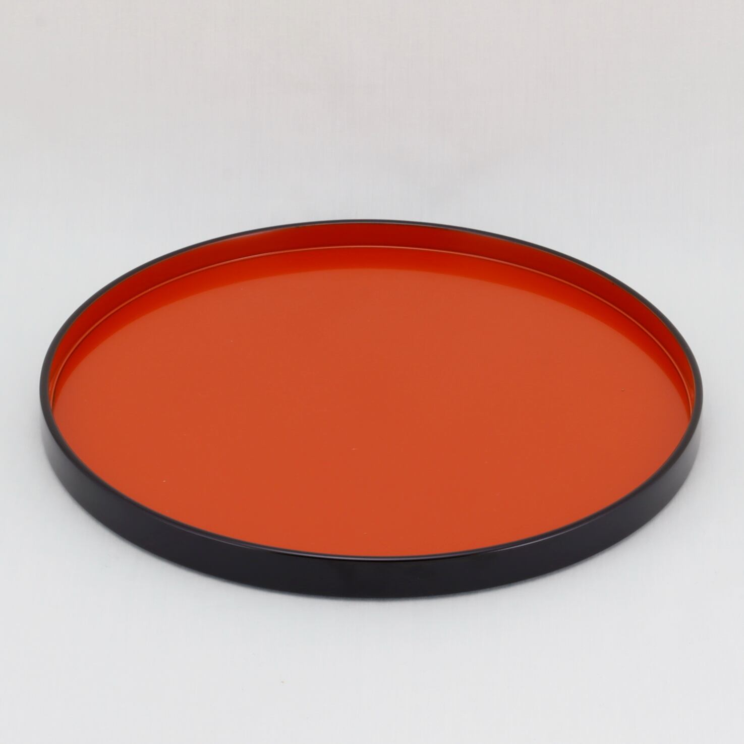 日本の美と伝統を堪能できる、輪島塗の丸盆です。 この丸盆は、約27.0㎝で黒内洗朱塗なっています。茶托に載せたお茶、またお料理等を運ぶのに使い勝手の良いお盆です。