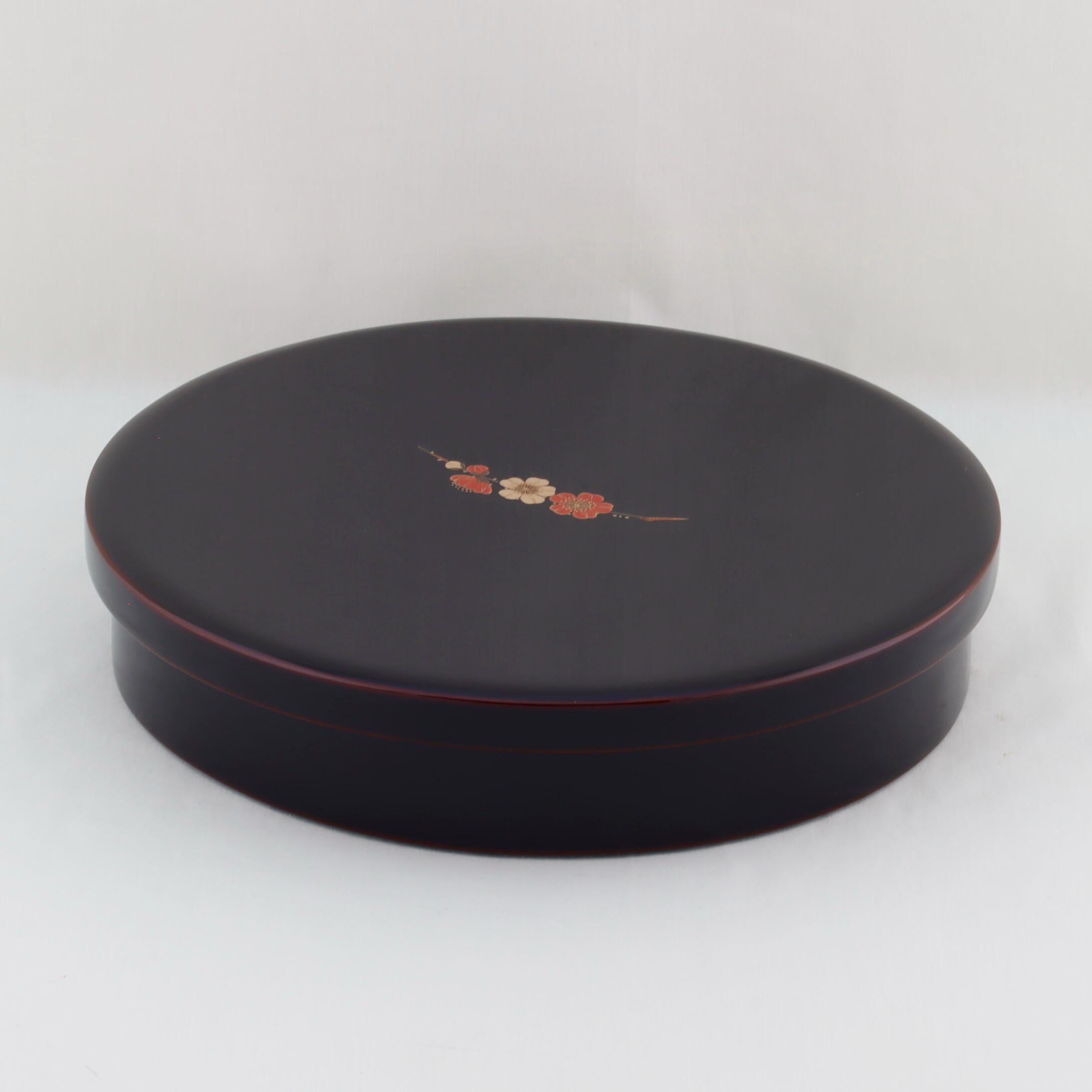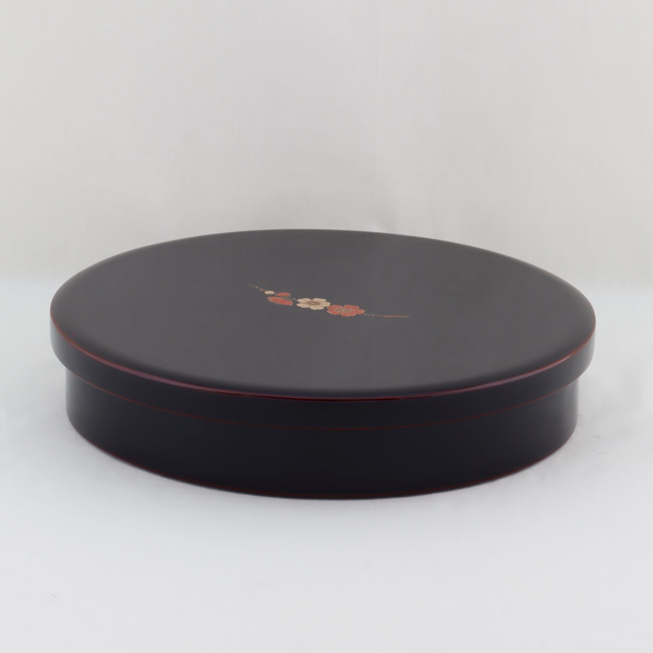 このオードブルは、溜塗に仕上げられ、蓋の上には紅白梅の蒔絵が施されています。梅の花が描かれたデザインは、優雅さと温かみを与え、特別なテーブルシーンを引き立てます。食材を美しく盛り付けるための仕切りが付いて、大切な場面を彩るのに最適です。