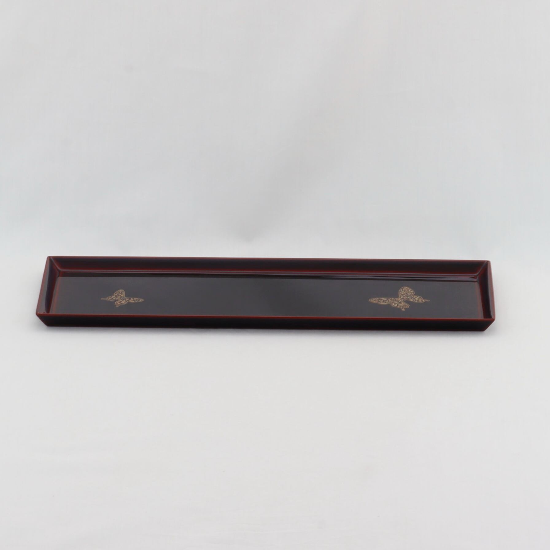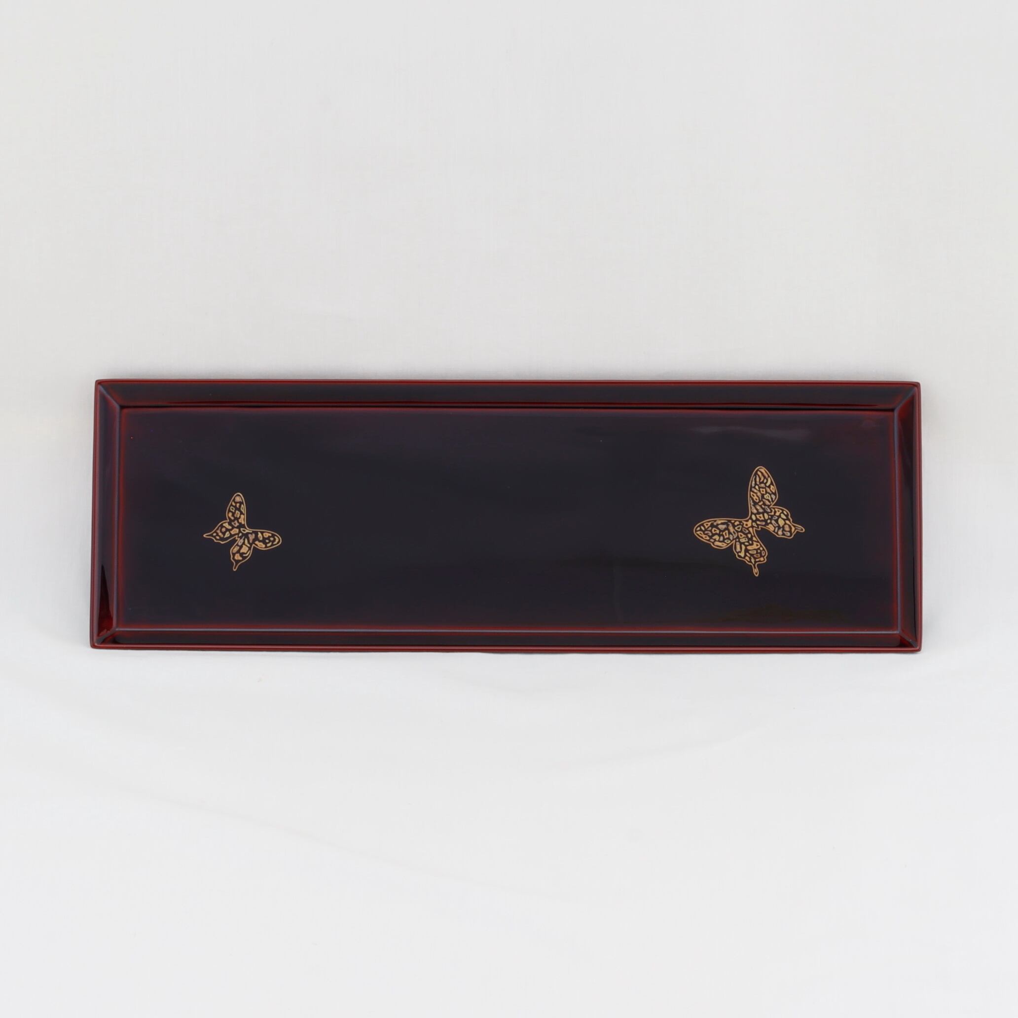 溜塗で仕上げられ、隅立形の直線は品格を漂わせ、上品な蝶蒔絵が施されています。優雅に飛ぶ蝶のデザインは、食卓に華を添え、日常の食事を特別なものに演出します。和の美をお楽しみいただけるこの皿は、どの料理とも相性抜群です!
