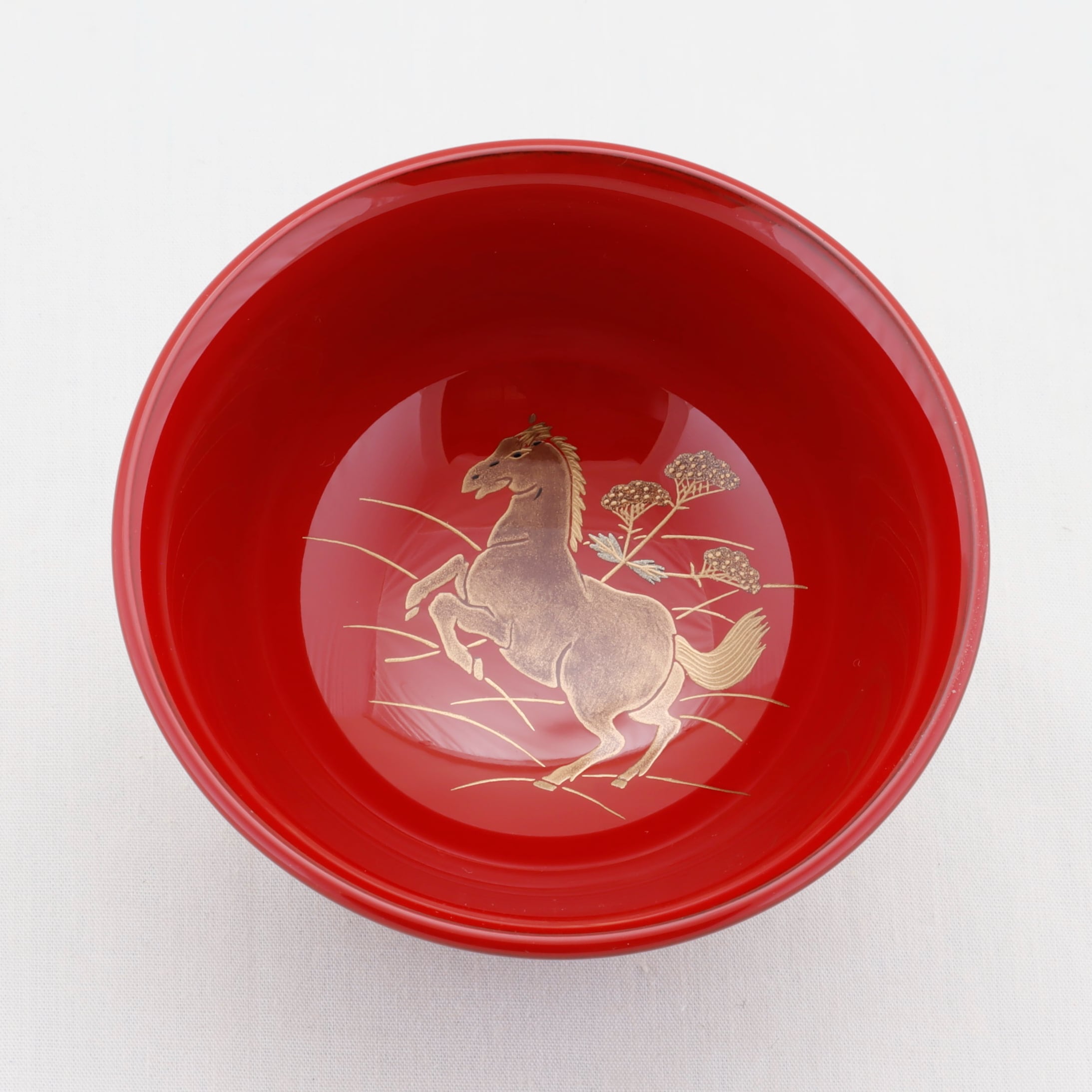このぐい吞みは、朱塗の艶やかな仕上げが施され、視覚的にも豊かな印象を与えます。特徴的な干支「午」蒔絵のデザインは、独自の個性を表現し、特別な瞬間をより一層引き立ててくれます。