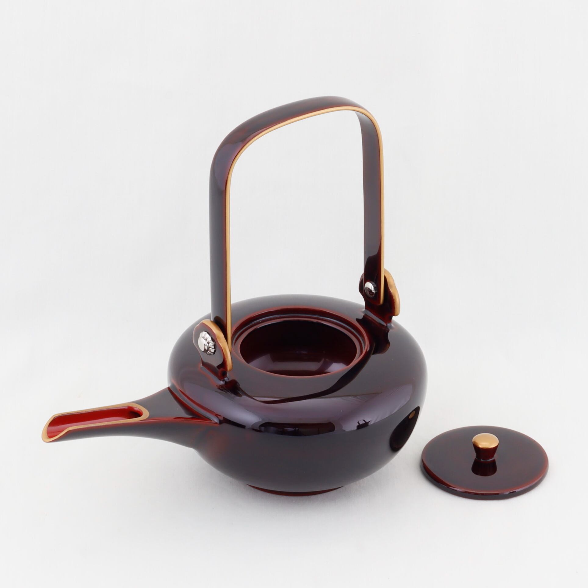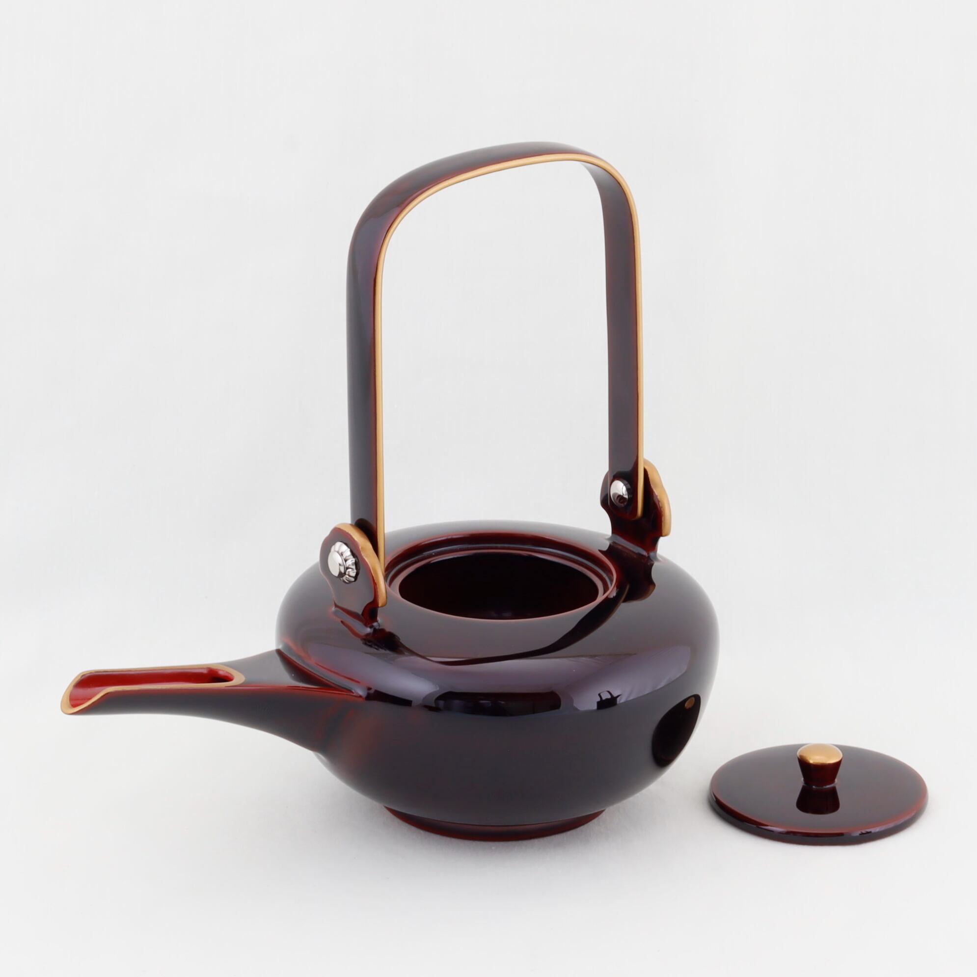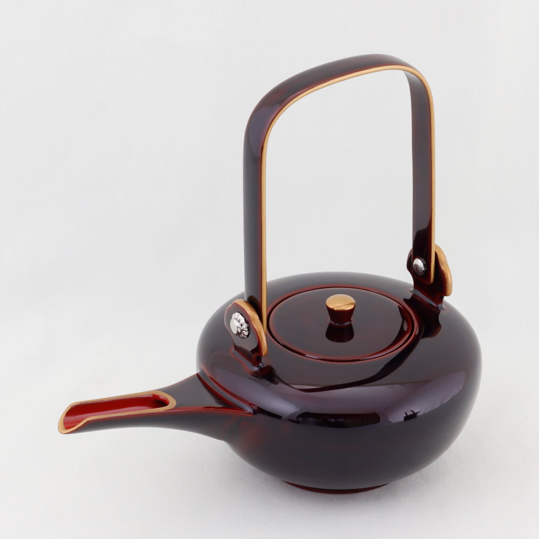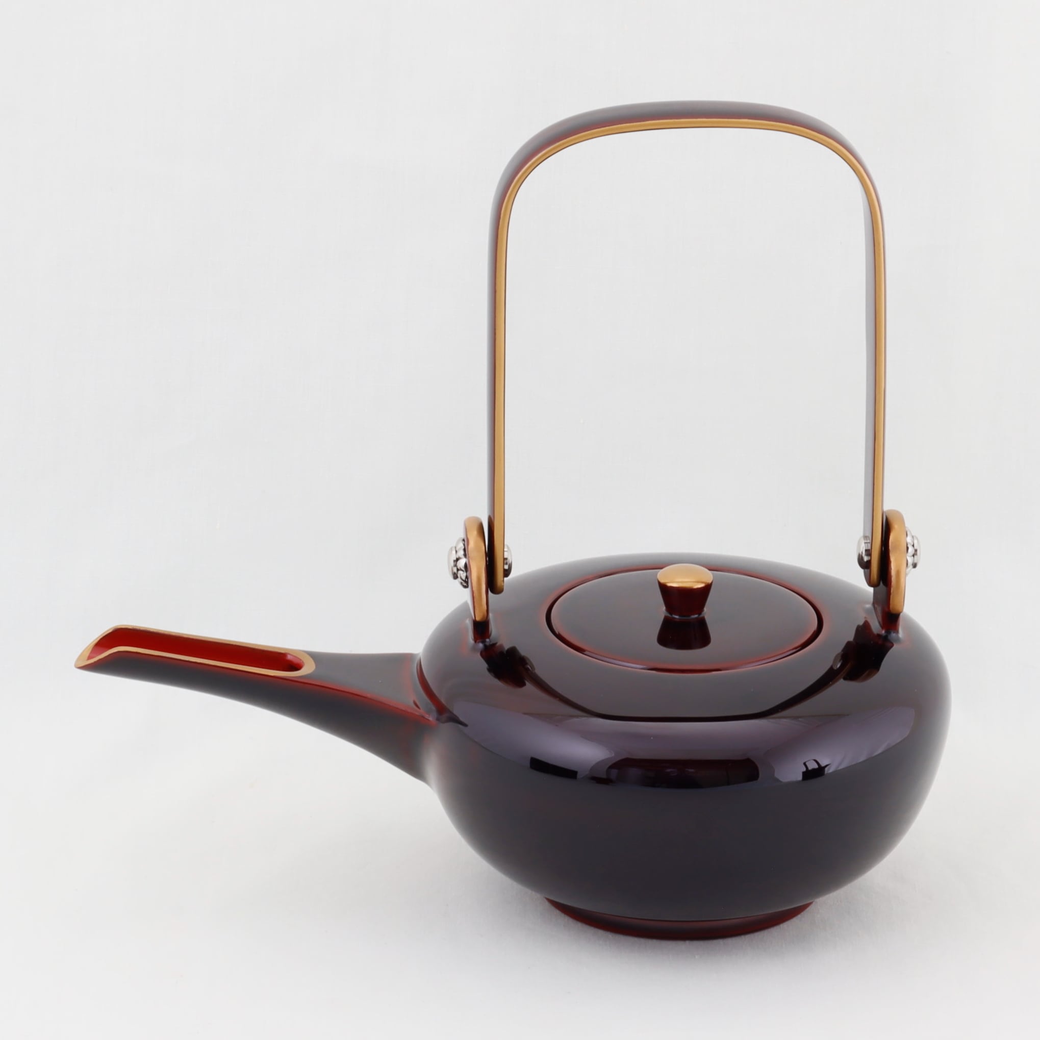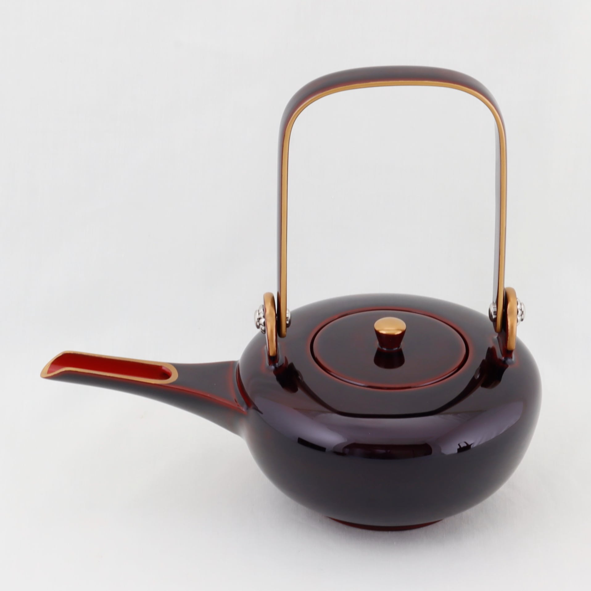この銚子は、深い溜塗に金縁が映える優雅なデザインで、日本酒を美しく引き立てるために特別に作られています。丸い形状が愛らしく、どんな食卓にもなじむことでしょう。