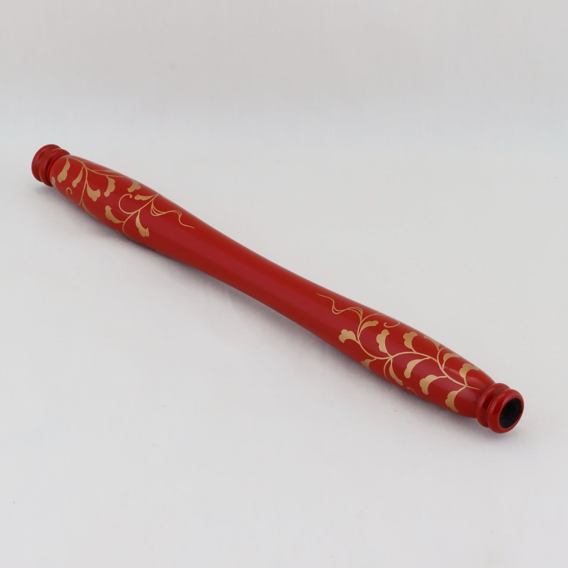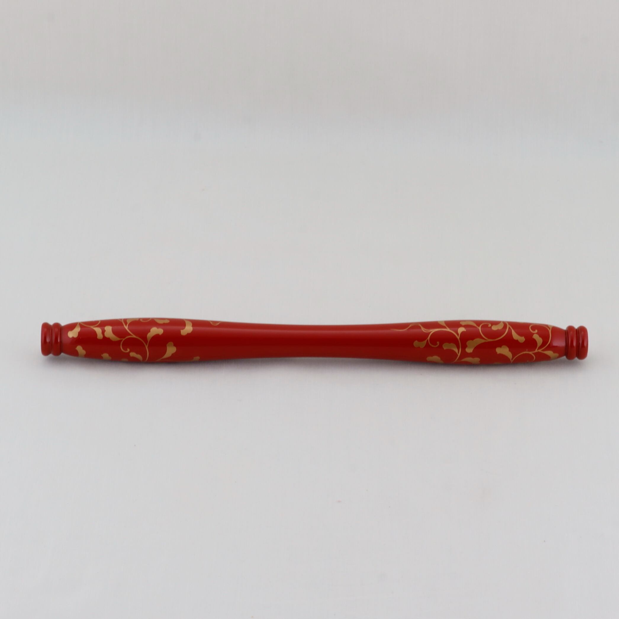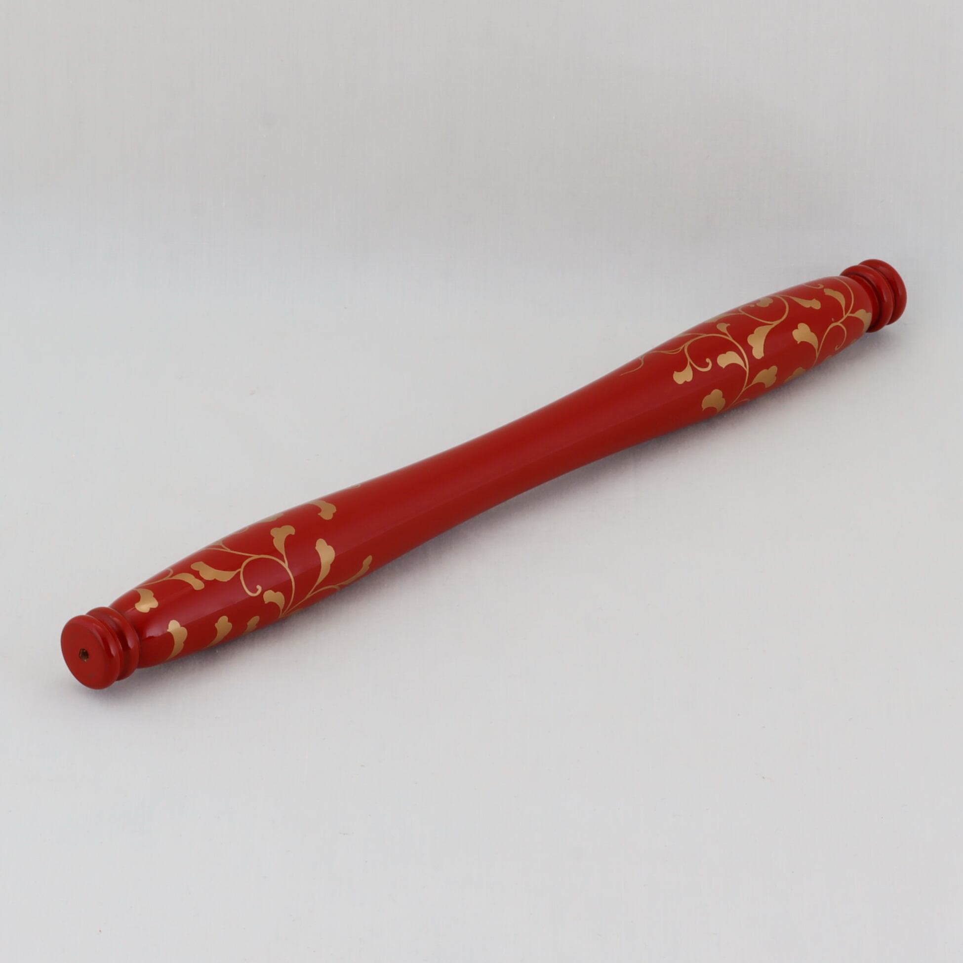 この払子は、朱塗りの美しい仕上がりに、伝統的な唐草蒔が描かれています。伝統的な形状は格調高く、荘厳な雰囲気を醸し出しています。