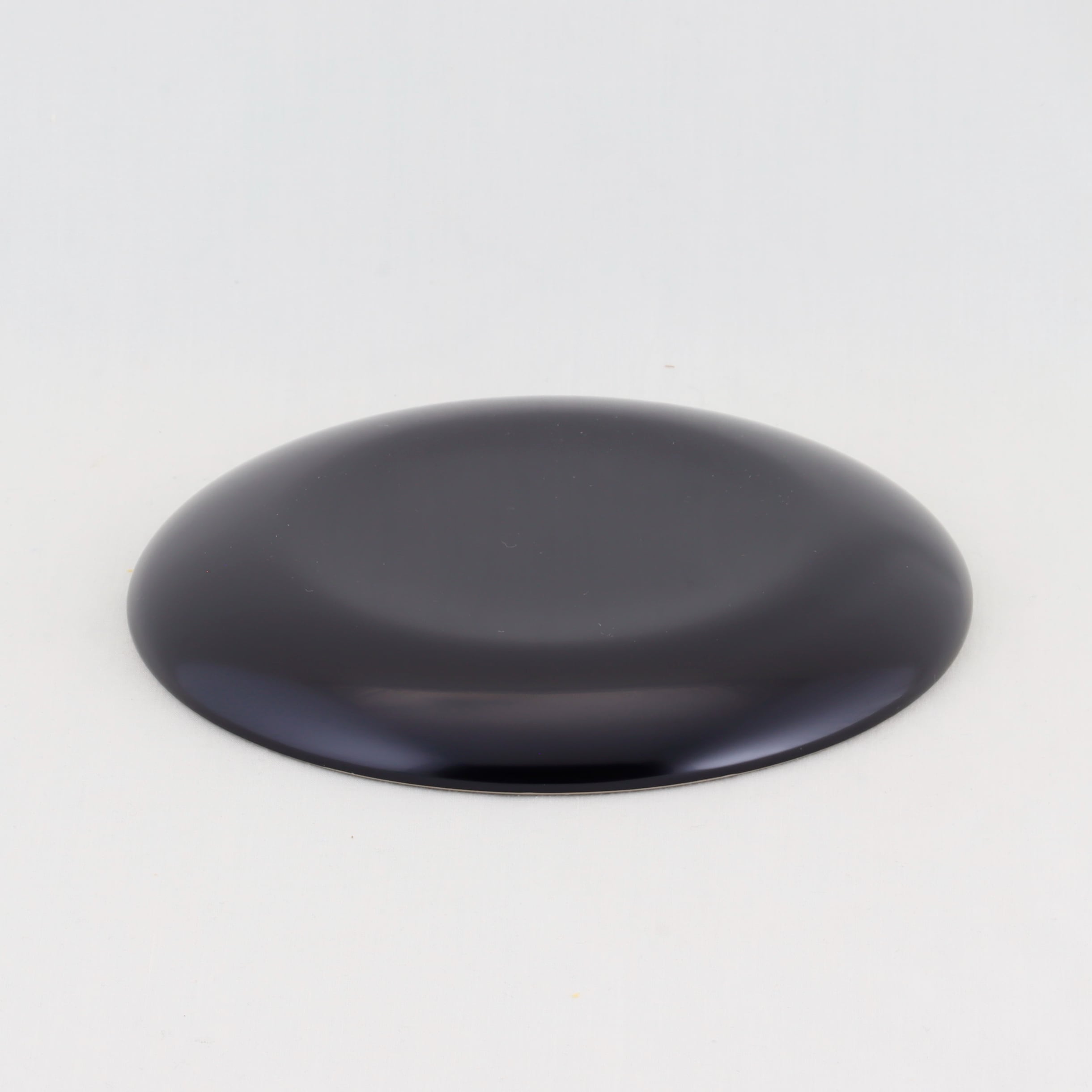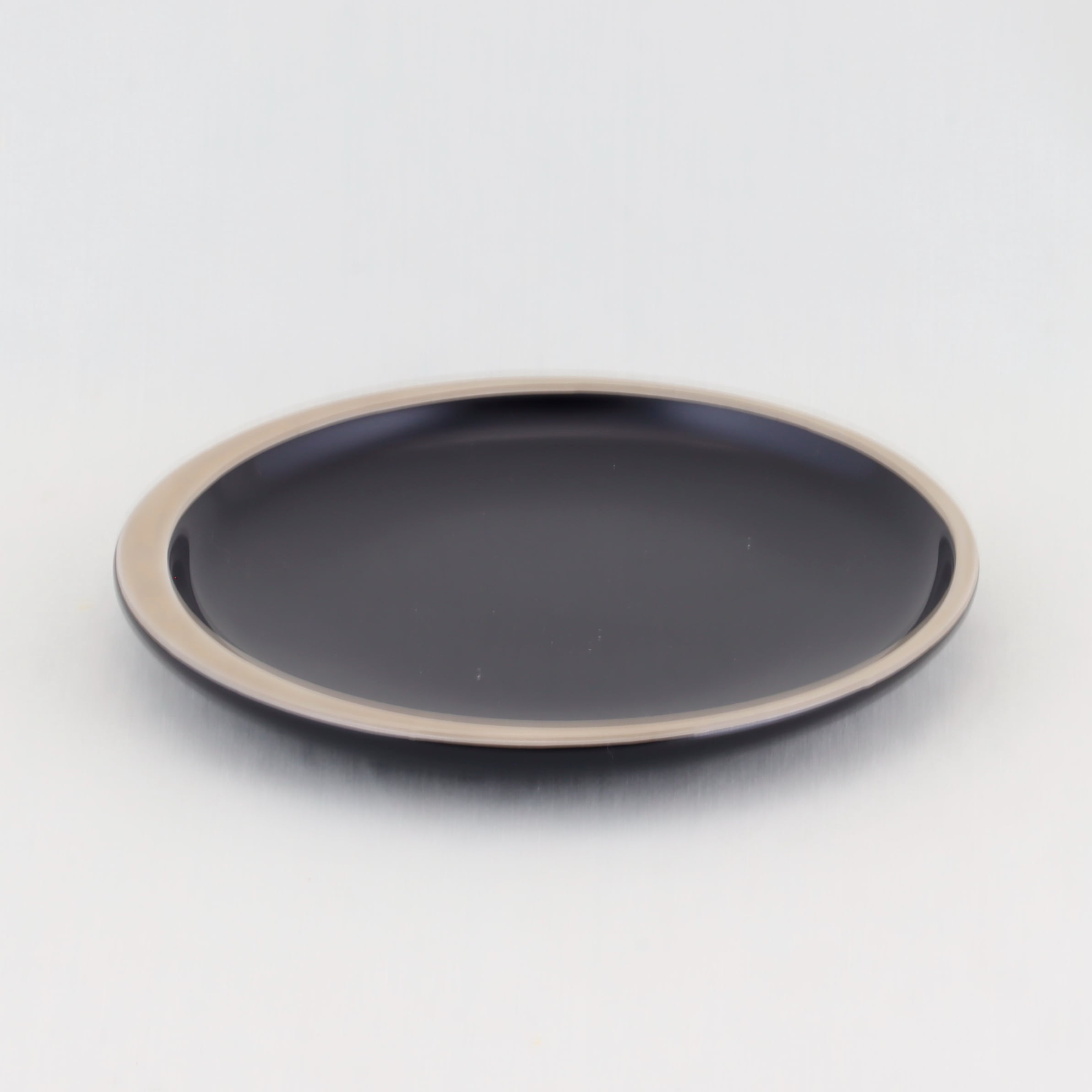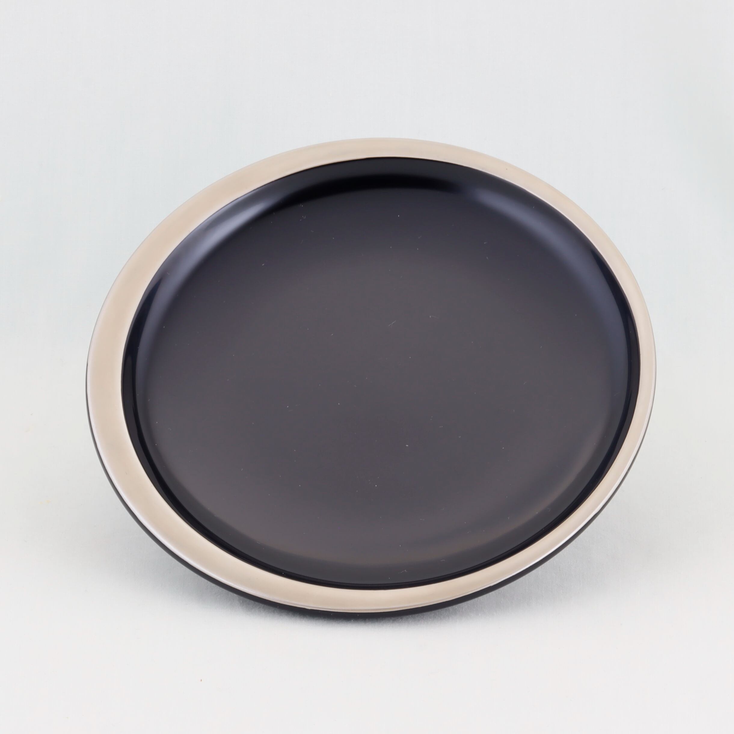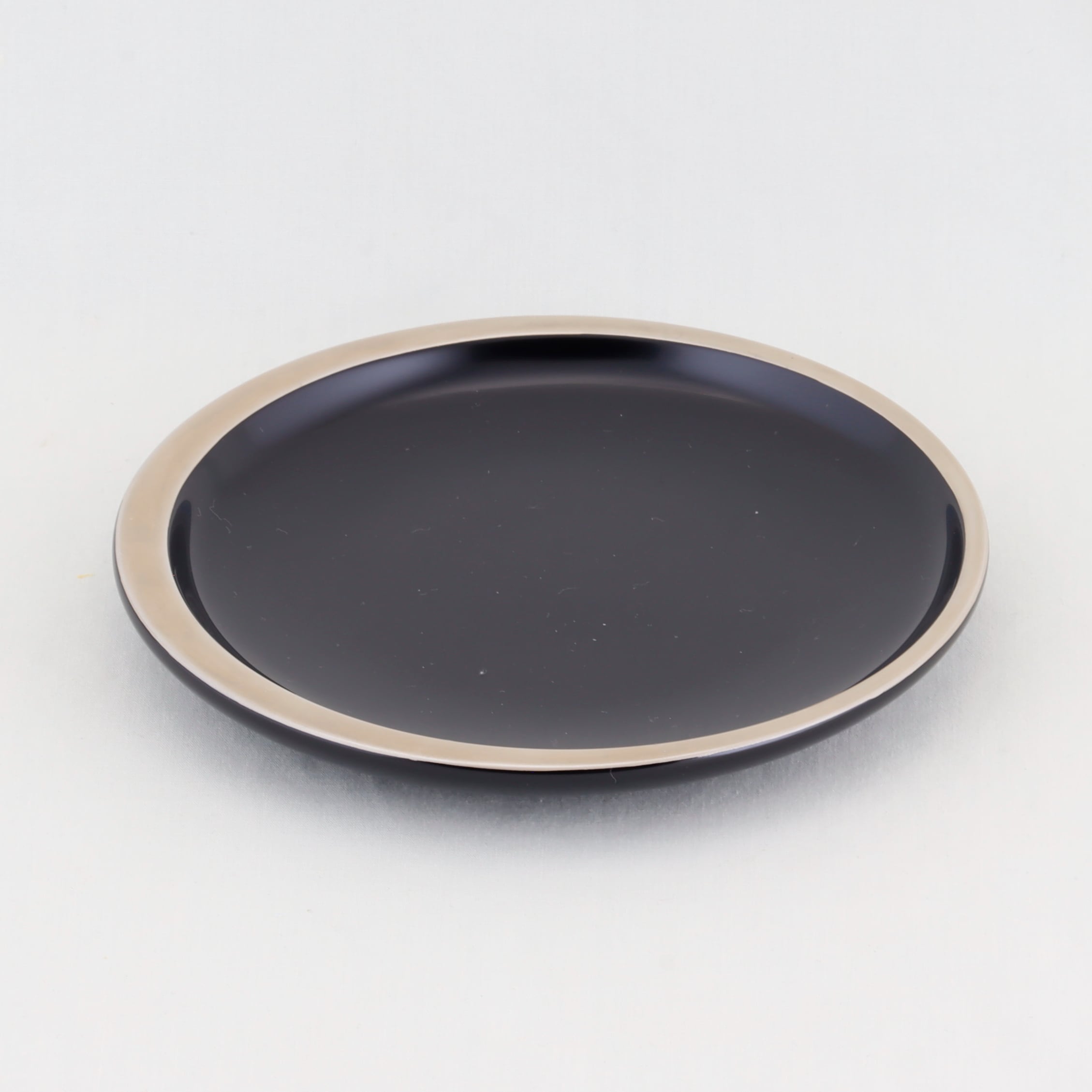 この銘々皿は、外側の円形を「太陽」に、上縁の三日月形を「月」に見立てて自然を感じる日月形なっています。銘々皿は黒塗が施され、三日月部分は銀縁蒔絵の装飾が施されています。自然の美しさを表現したこのデザインは、どんな料理でも一層引き立てます。