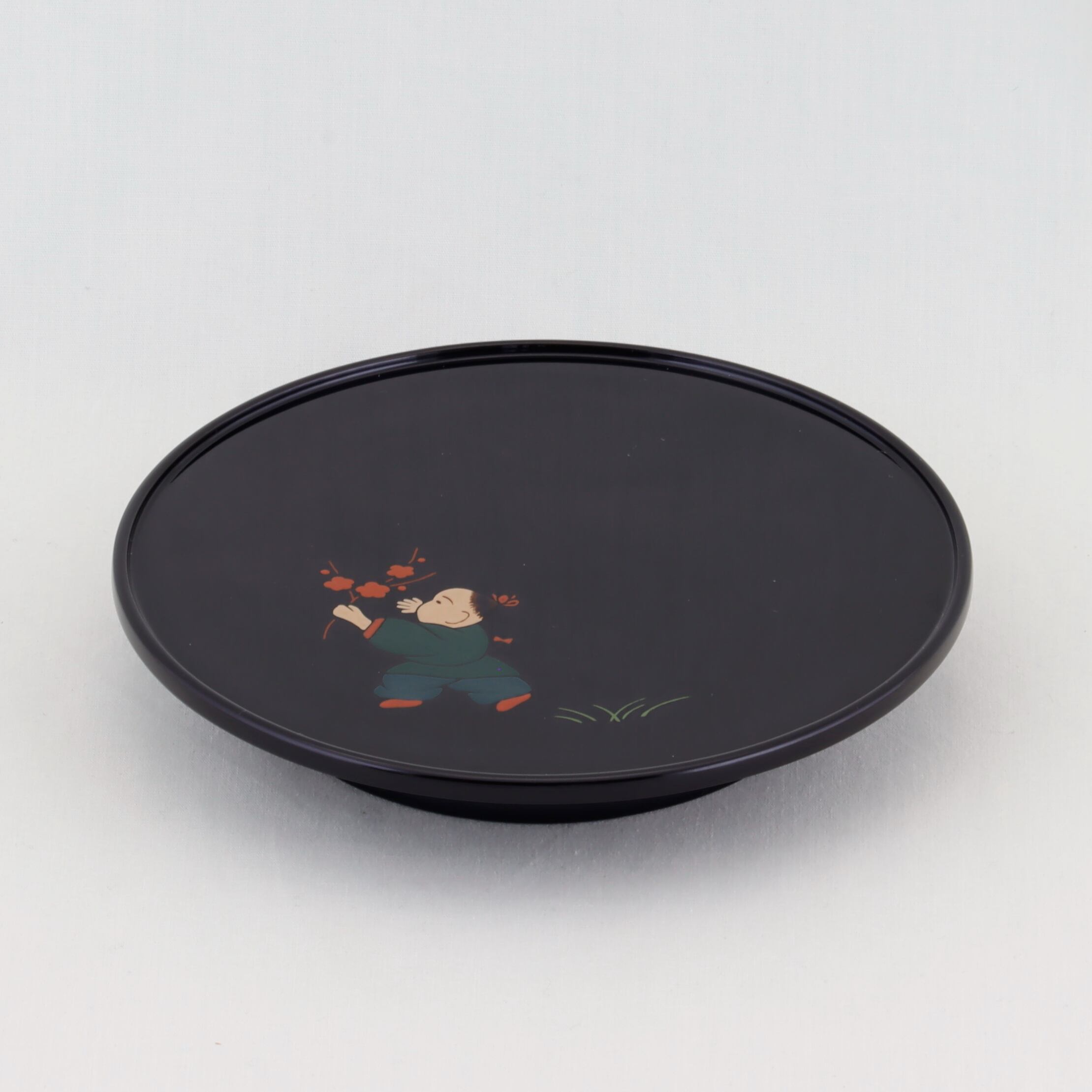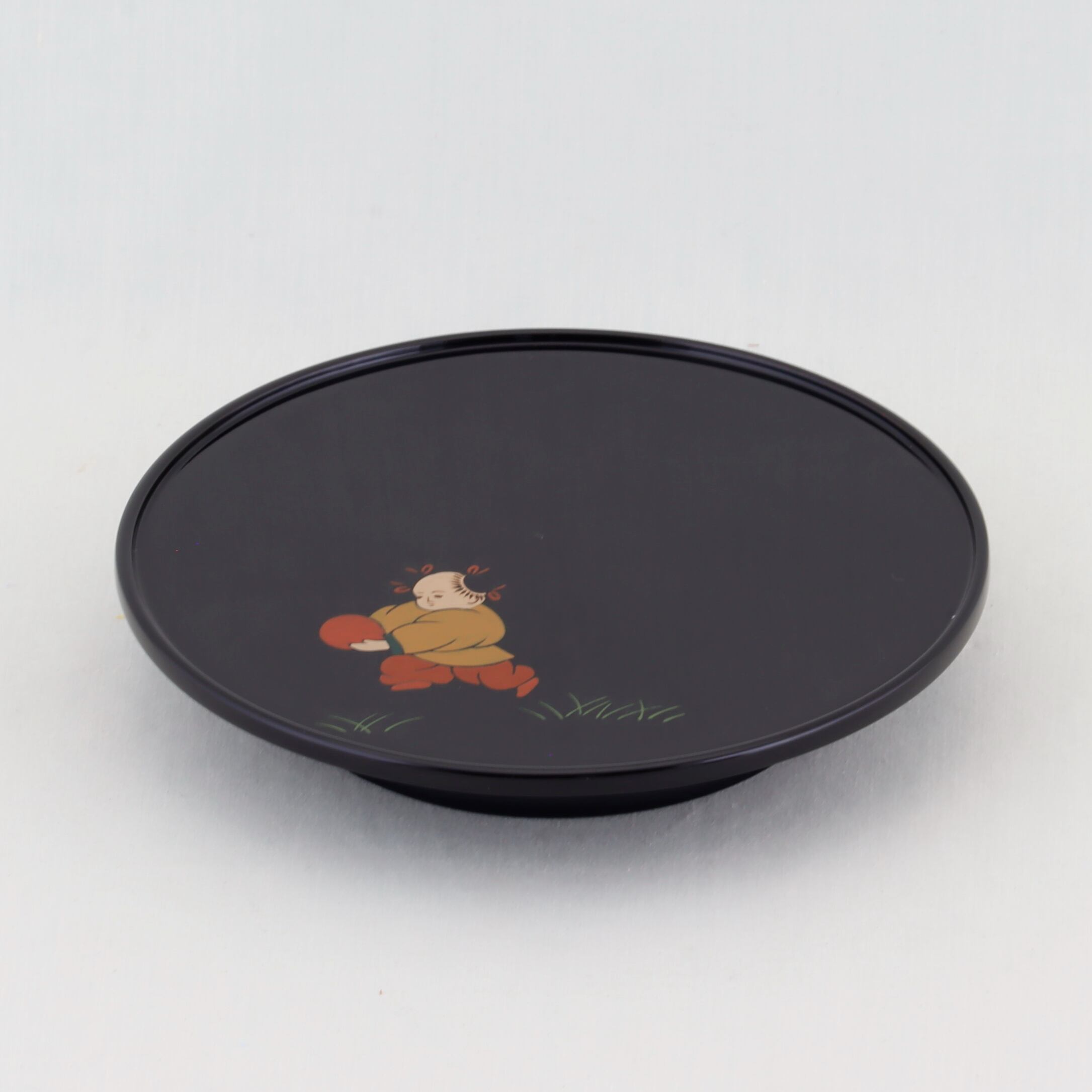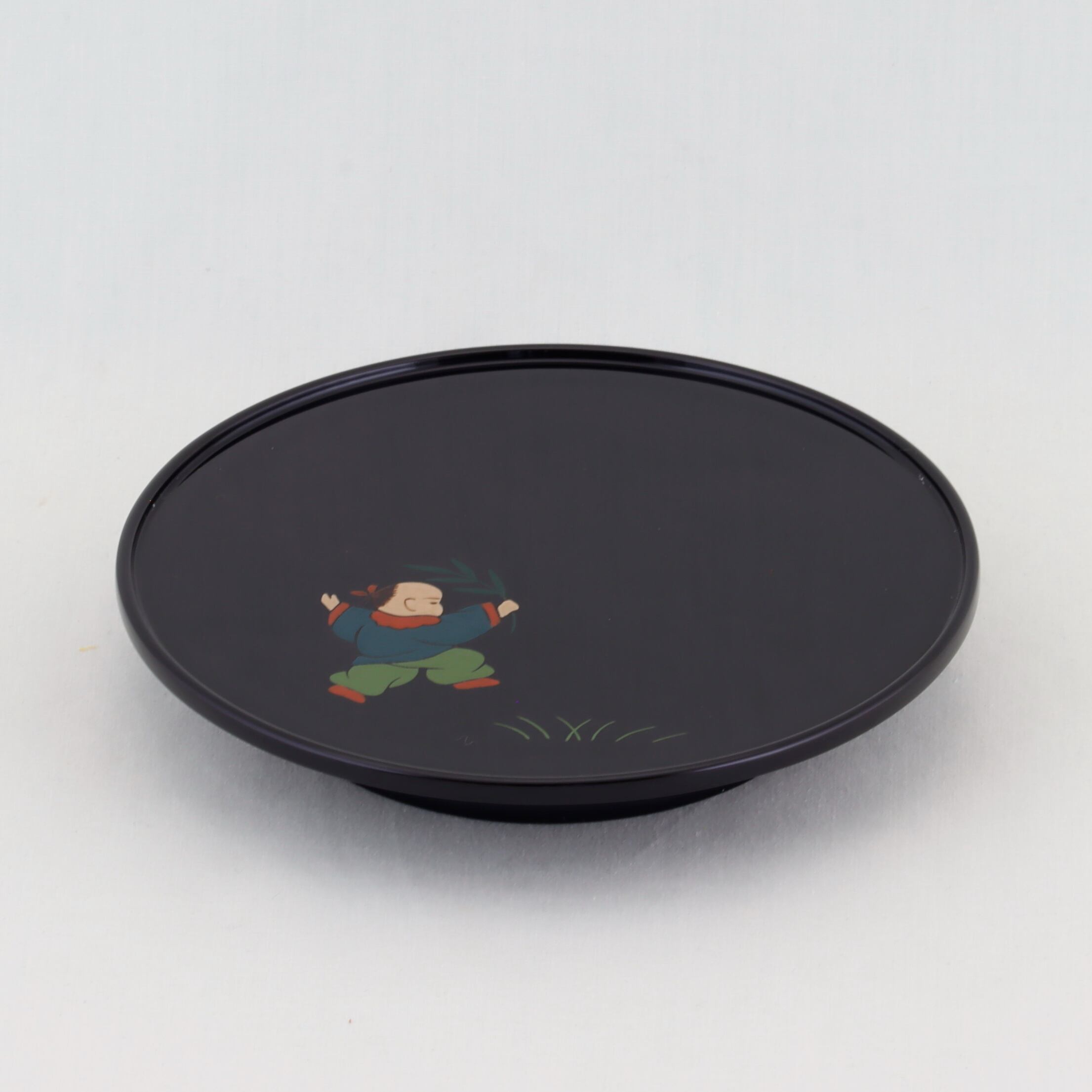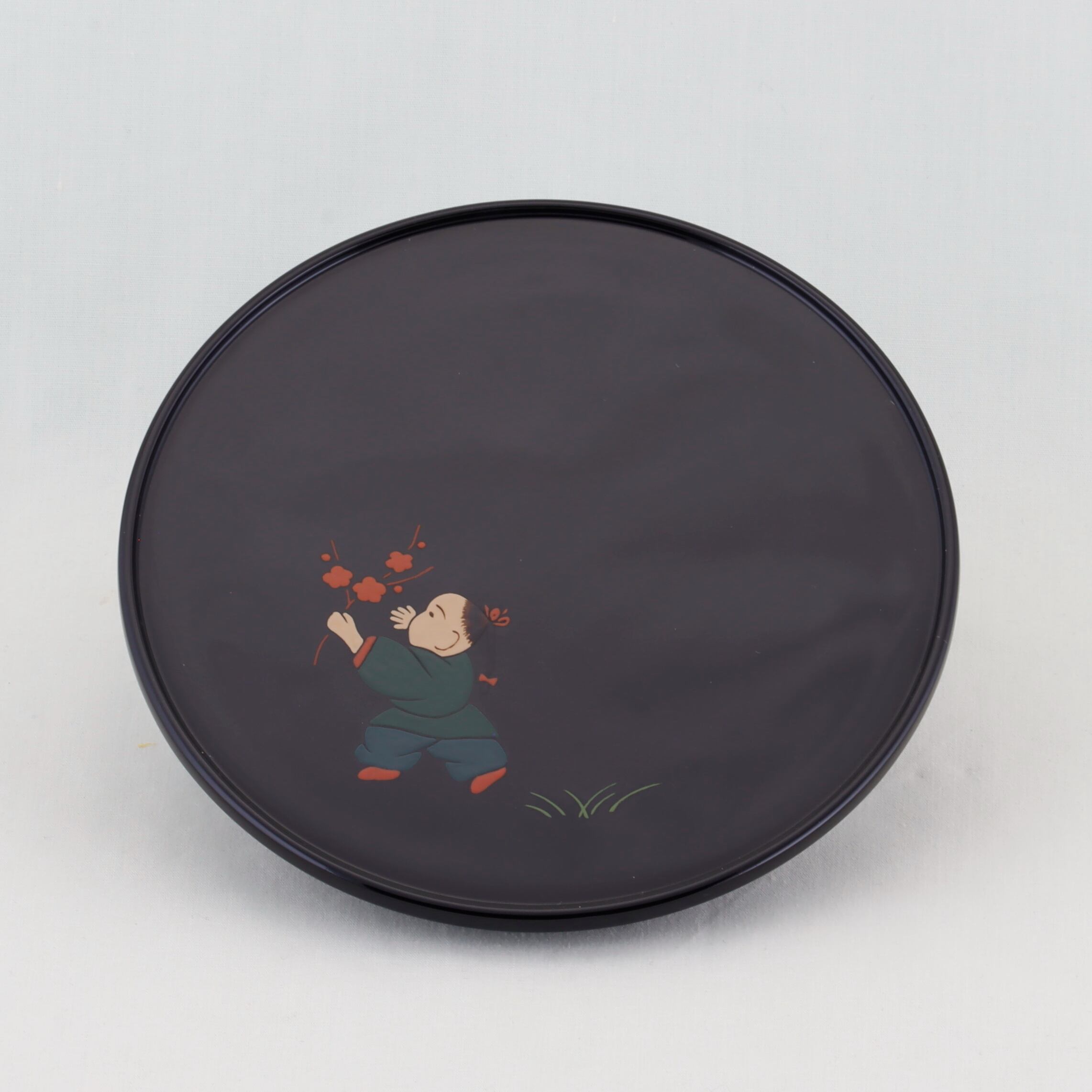 この銘々皿は、伝統美と格式が感じられる高台形にデザインされ、総黒塗の美しい仕上がりが特徴です。内側には、可愛い唐子の絵替わり蒔絵が施されています。