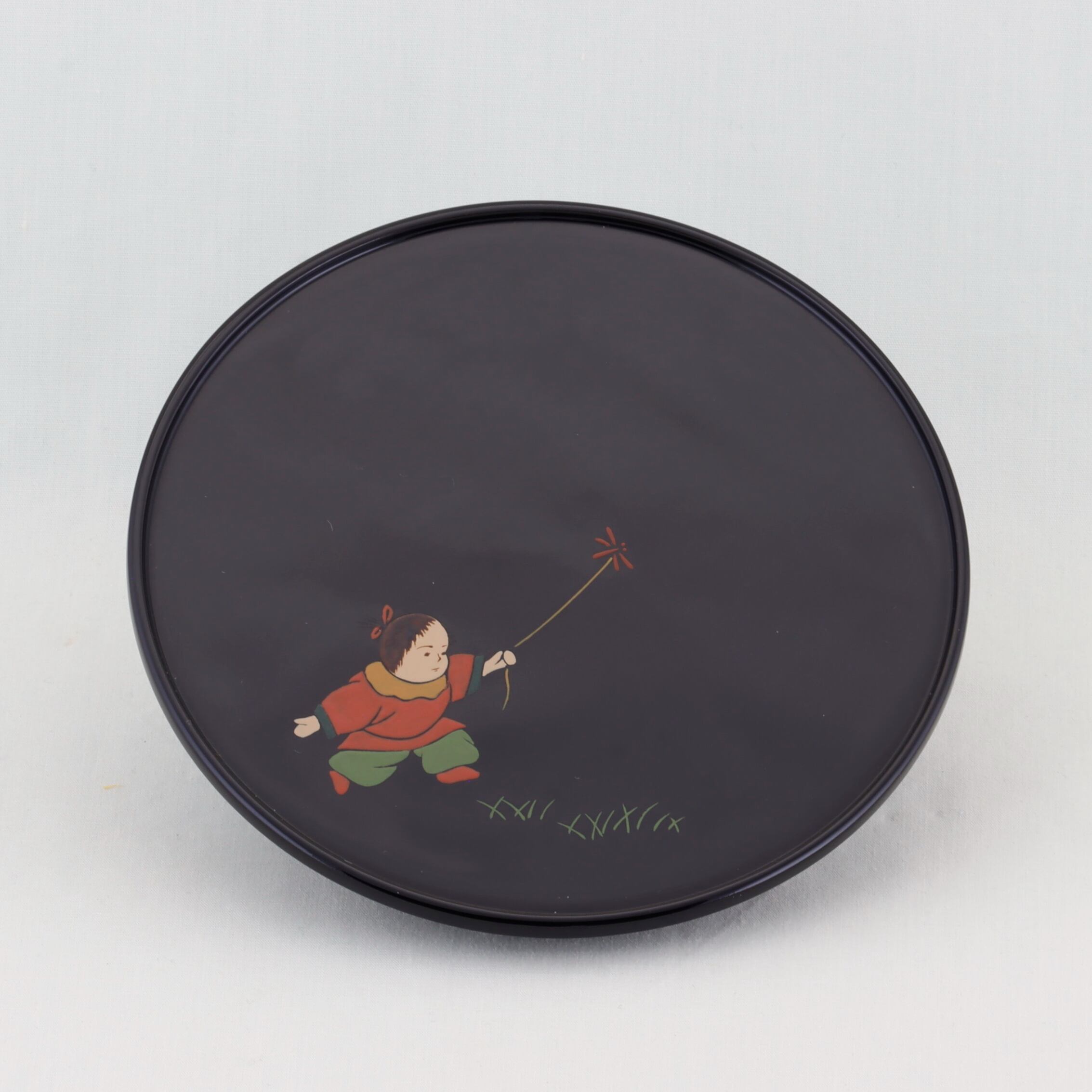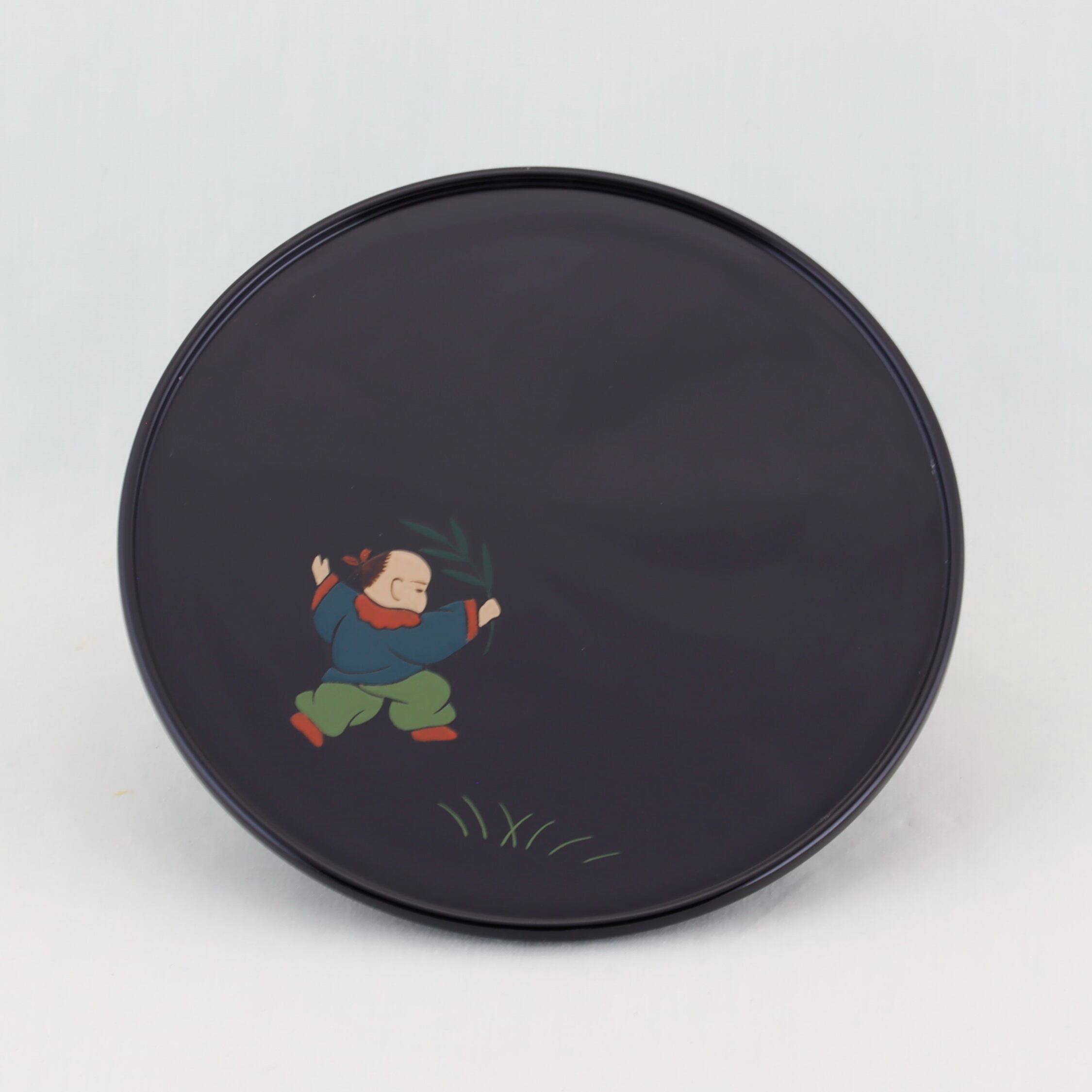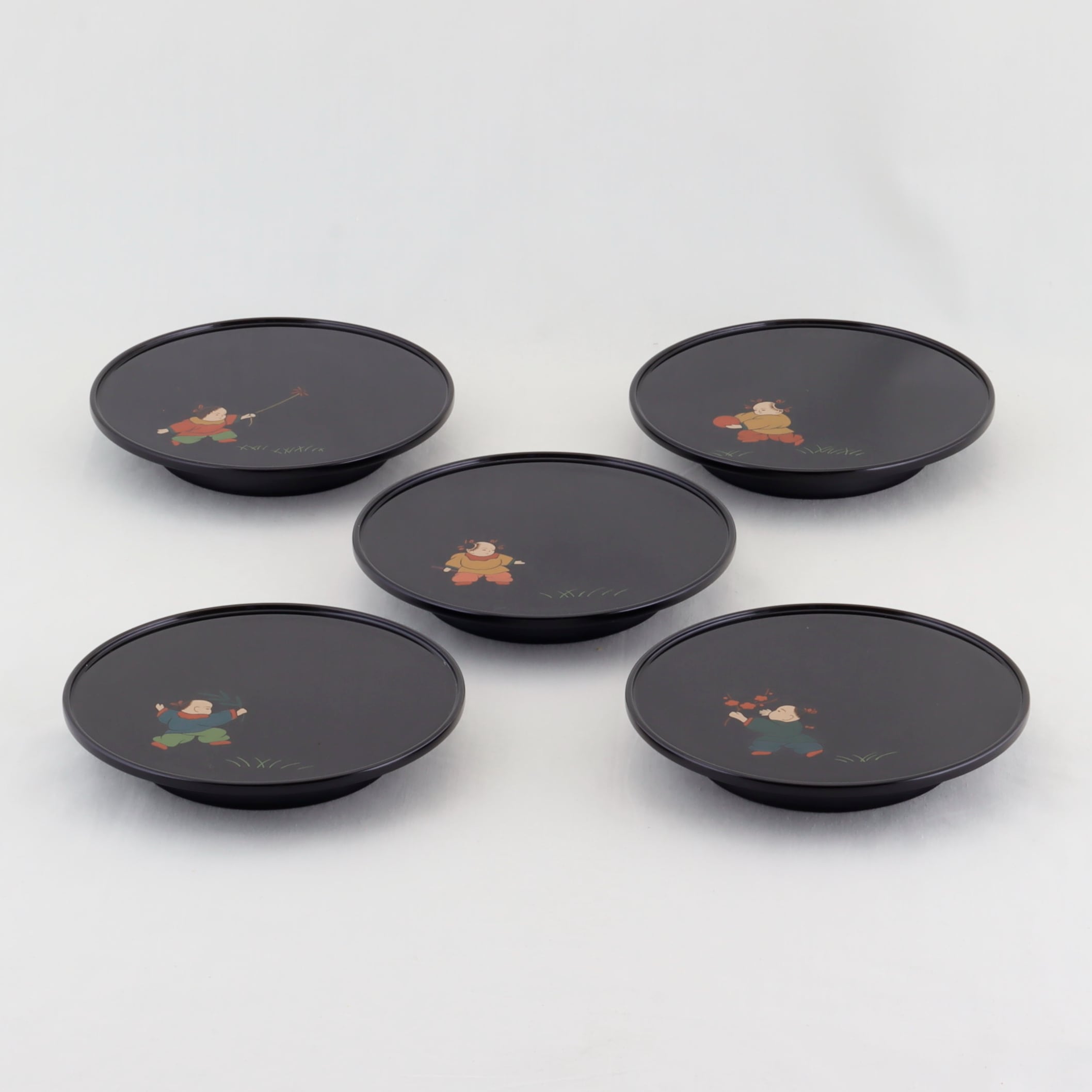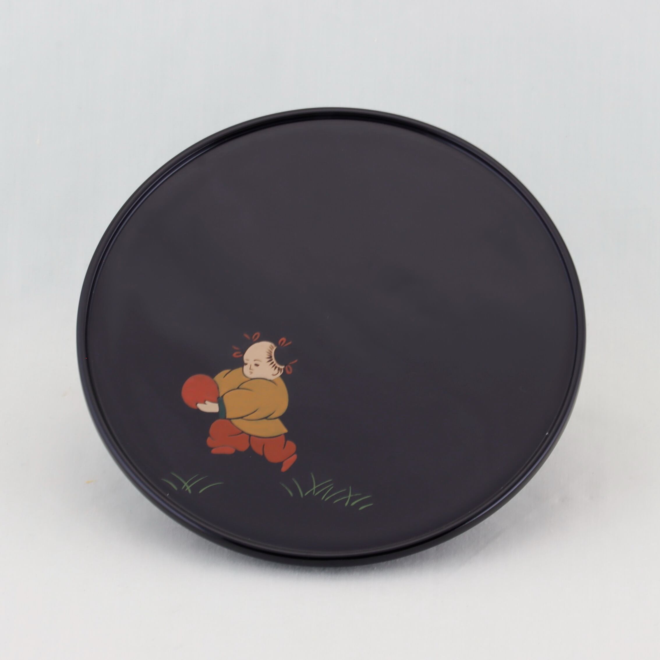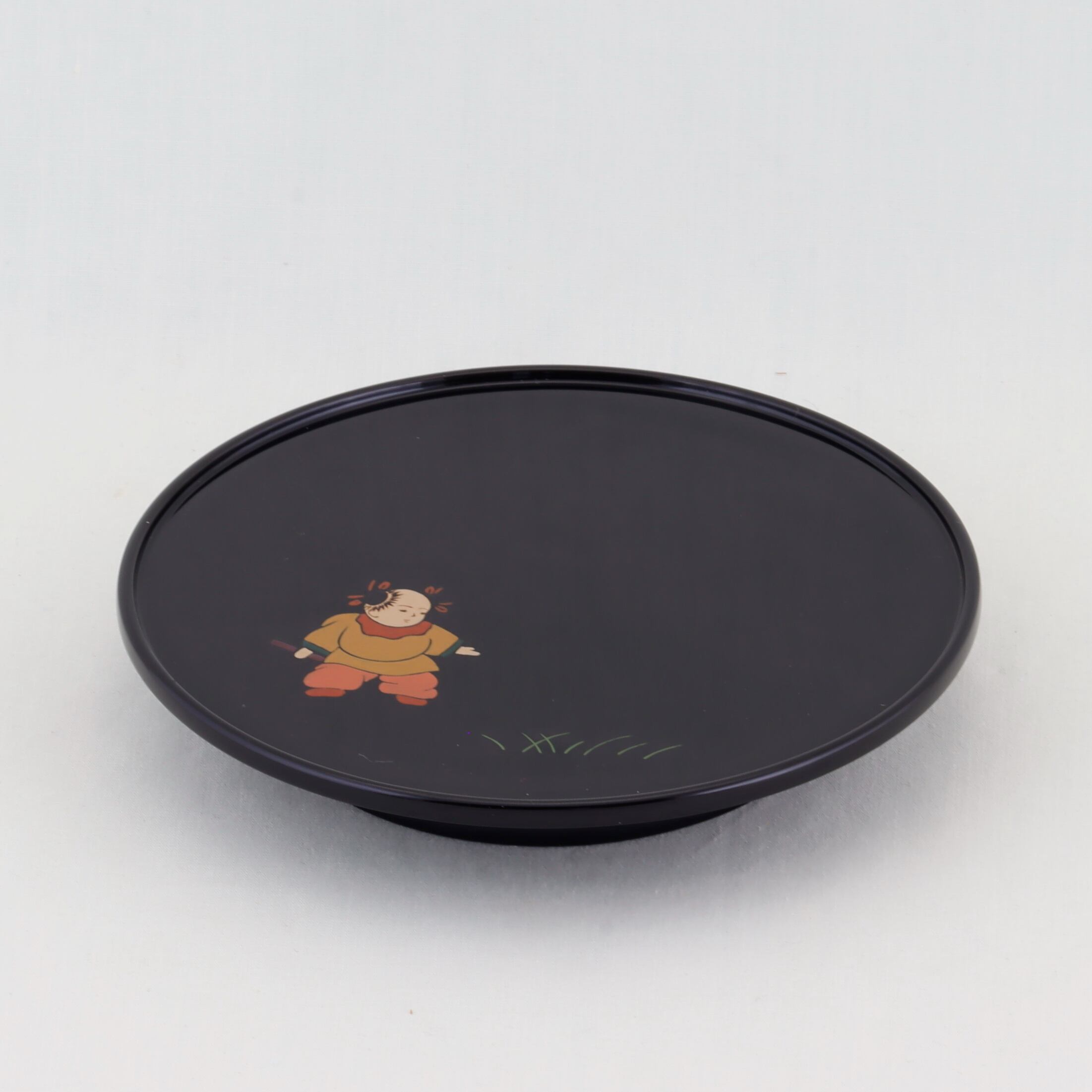 この銘々皿は、伝統美と格式が感じられる高台形にデザインされ、総黒塗の美しい仕上がりが特徴です。内側には、可愛い唐子の絵替わり蒔絵が施されています。