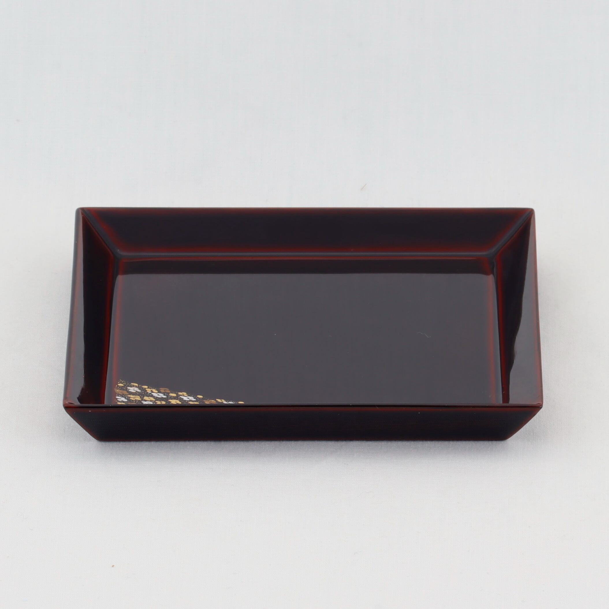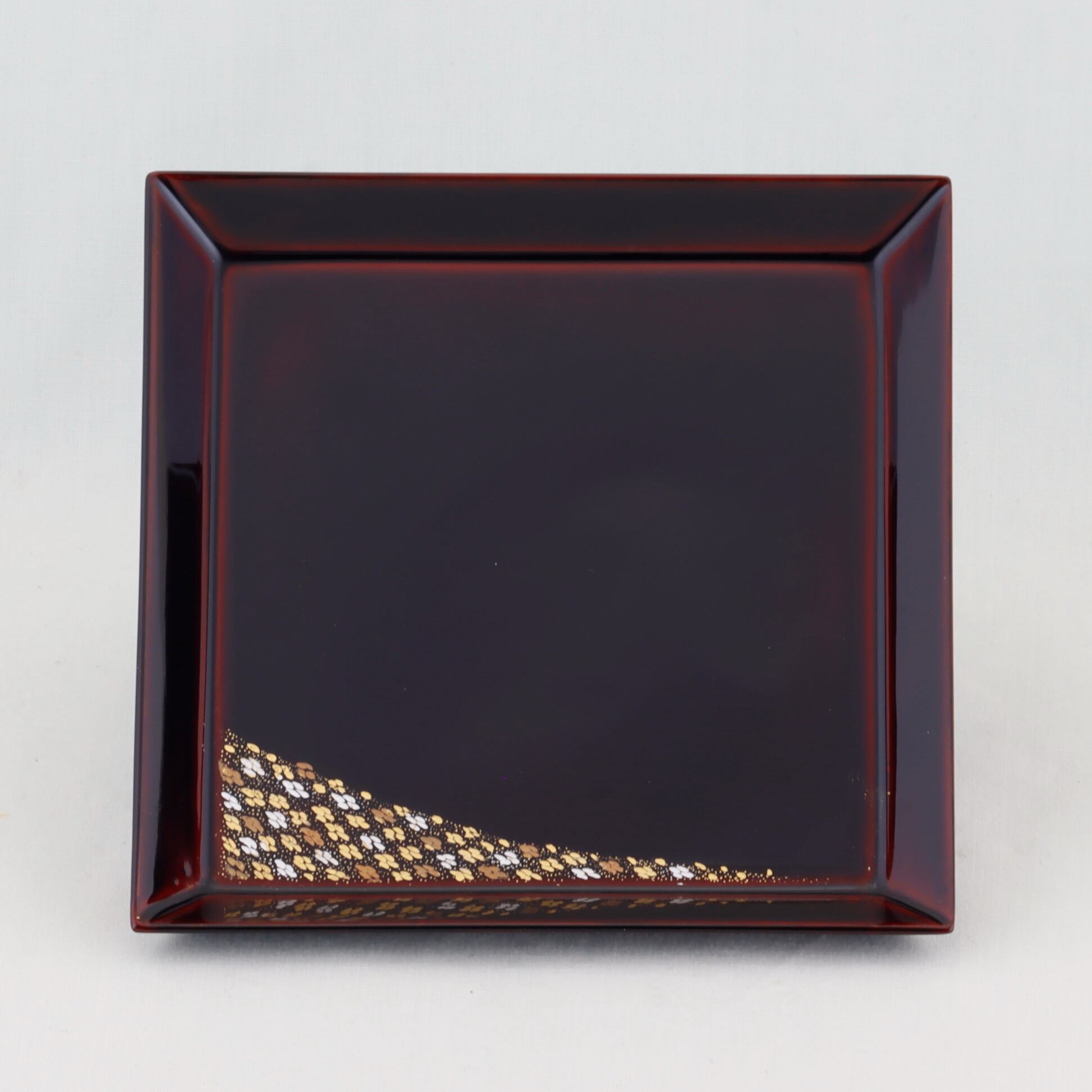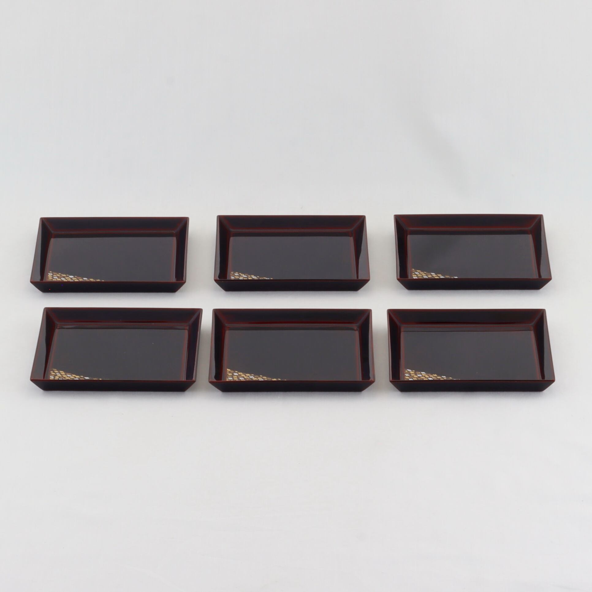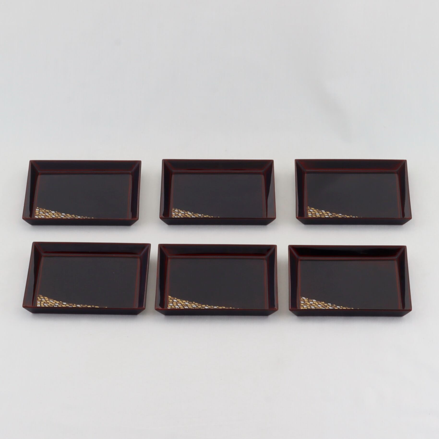 この銘々皿は、洗練された角隅立形にデザインされ、溜塗の深い色合いが特徴です。内側には、繊細な小華沈金が施され、華やかさを加えています。四角形六枚のセットとなっております。