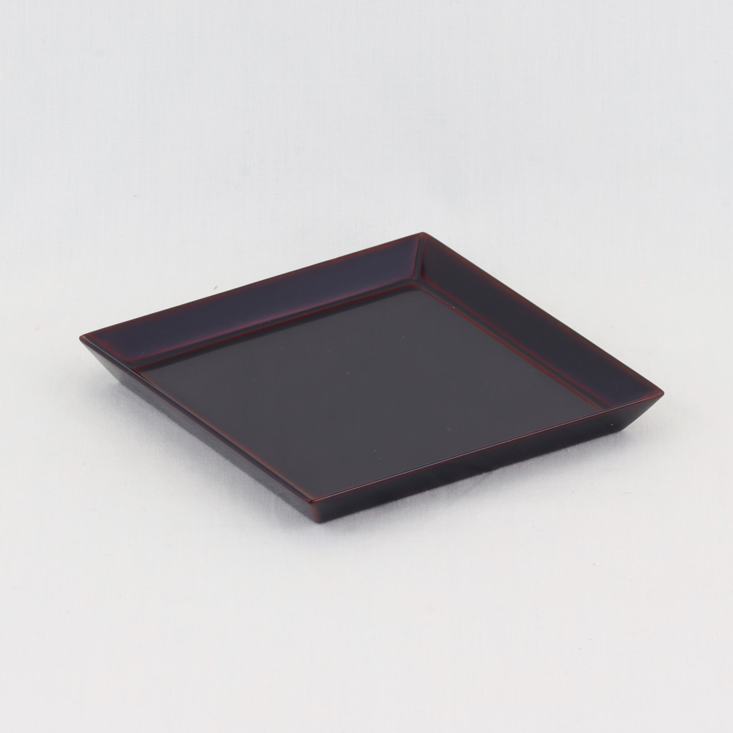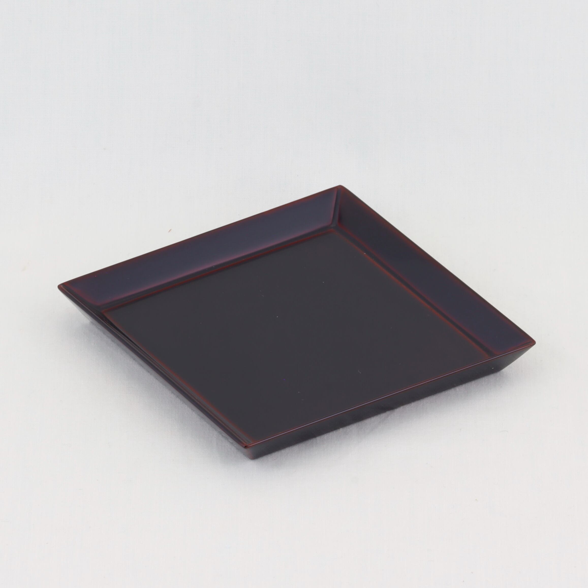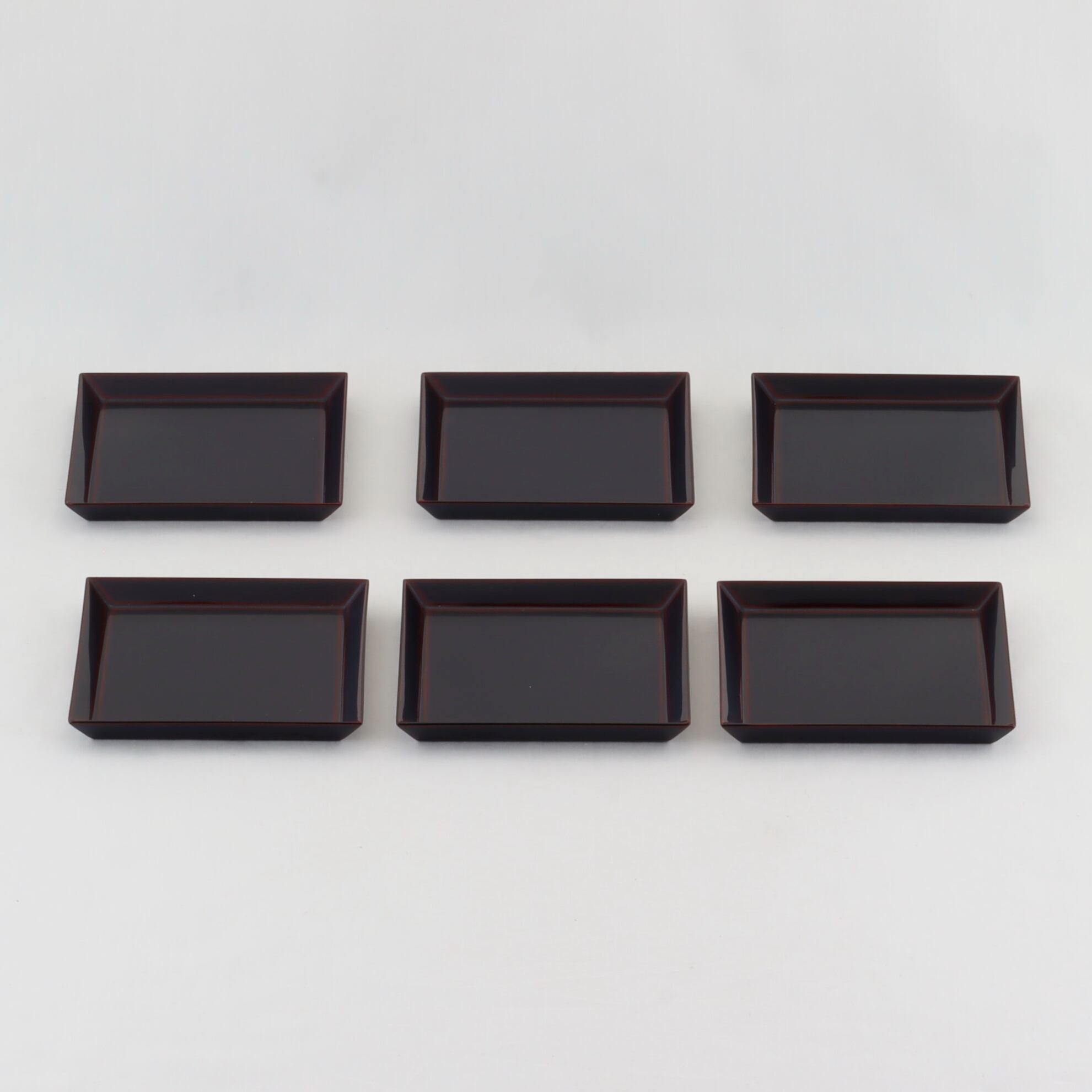 この銘々皿は、洗練された角隅立形にデザインされ、溜塗の深い色合いが特徴です。四角形六枚のセットとなっております。