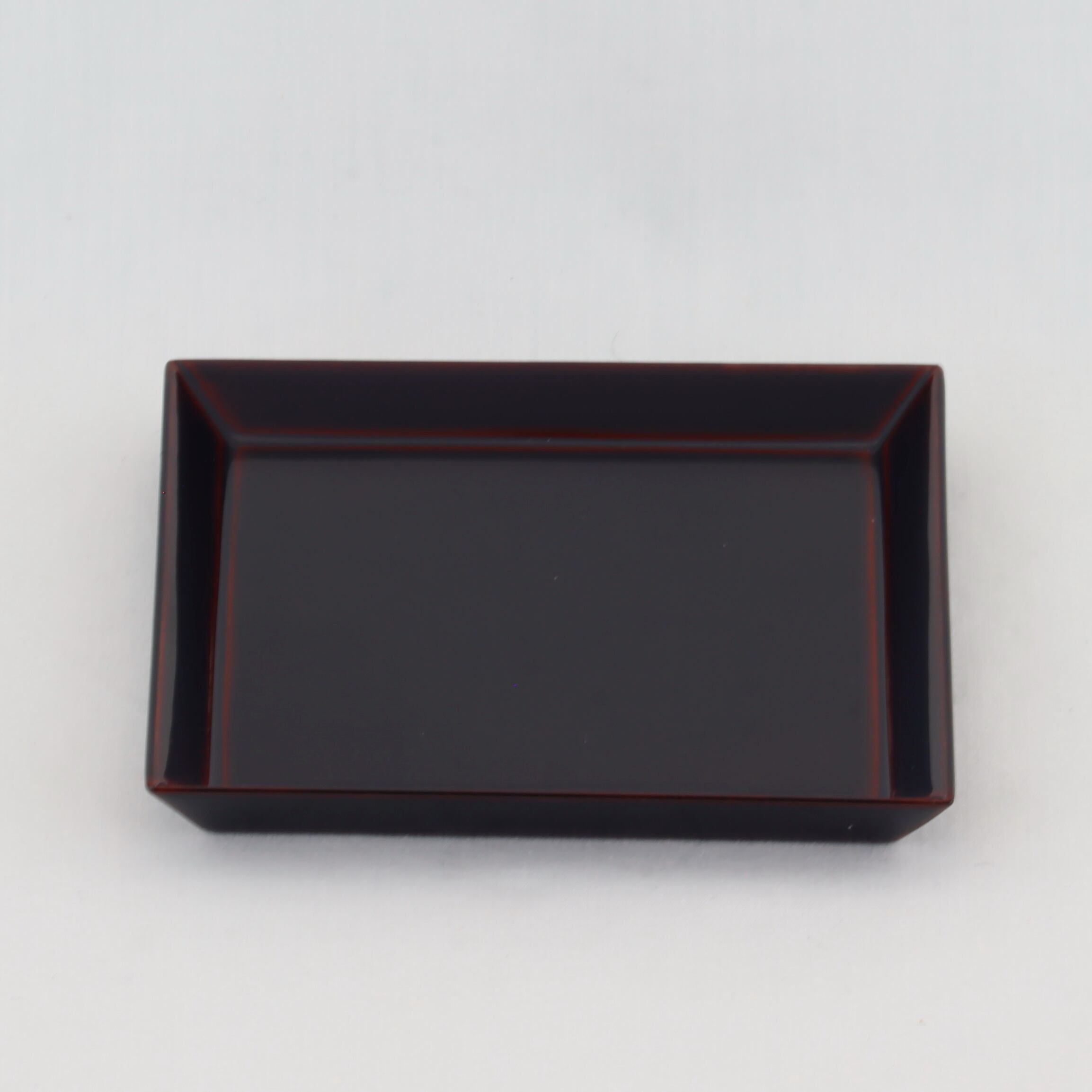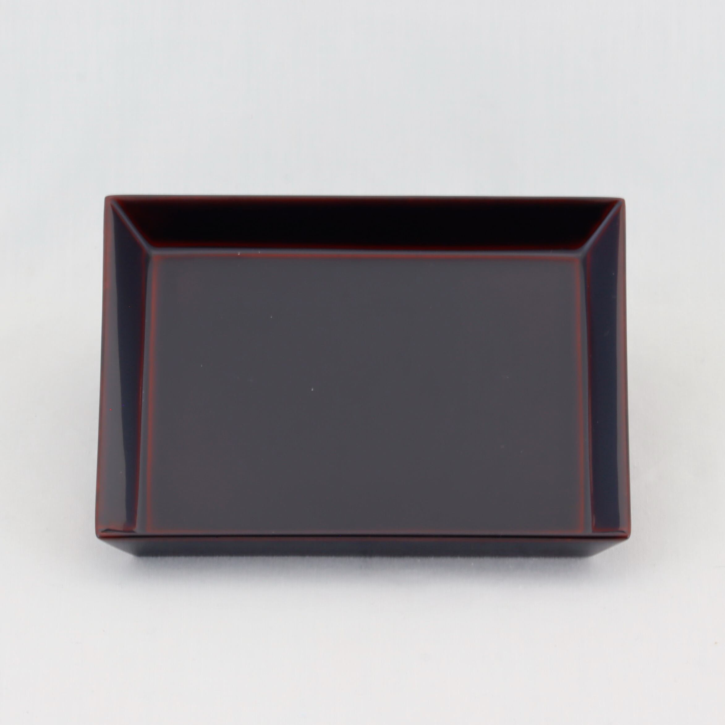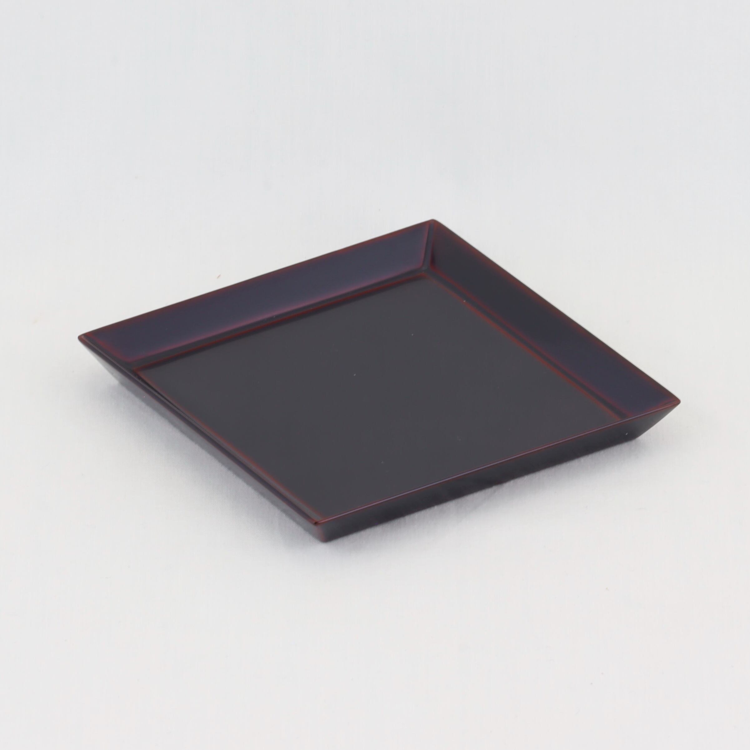 この銘々皿は、洗練された角隅立形にデザインされ、溜塗の深い色合いが特徴です。四角形六枚のセットとなっております。