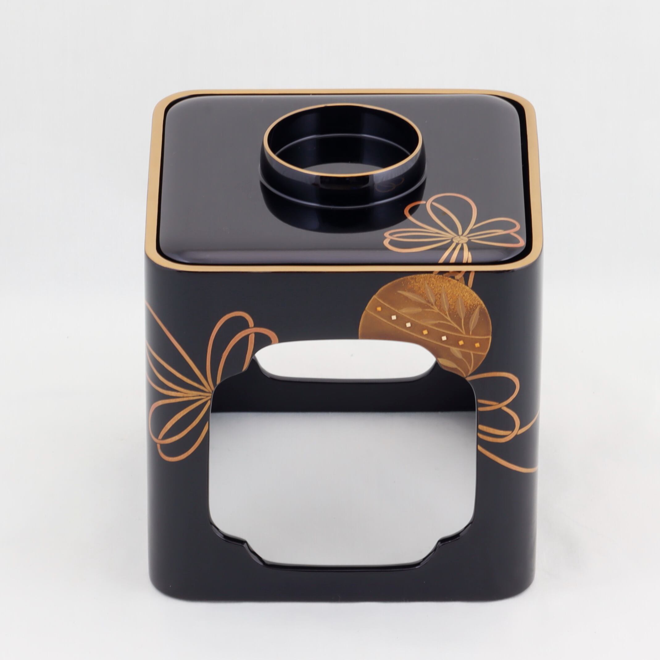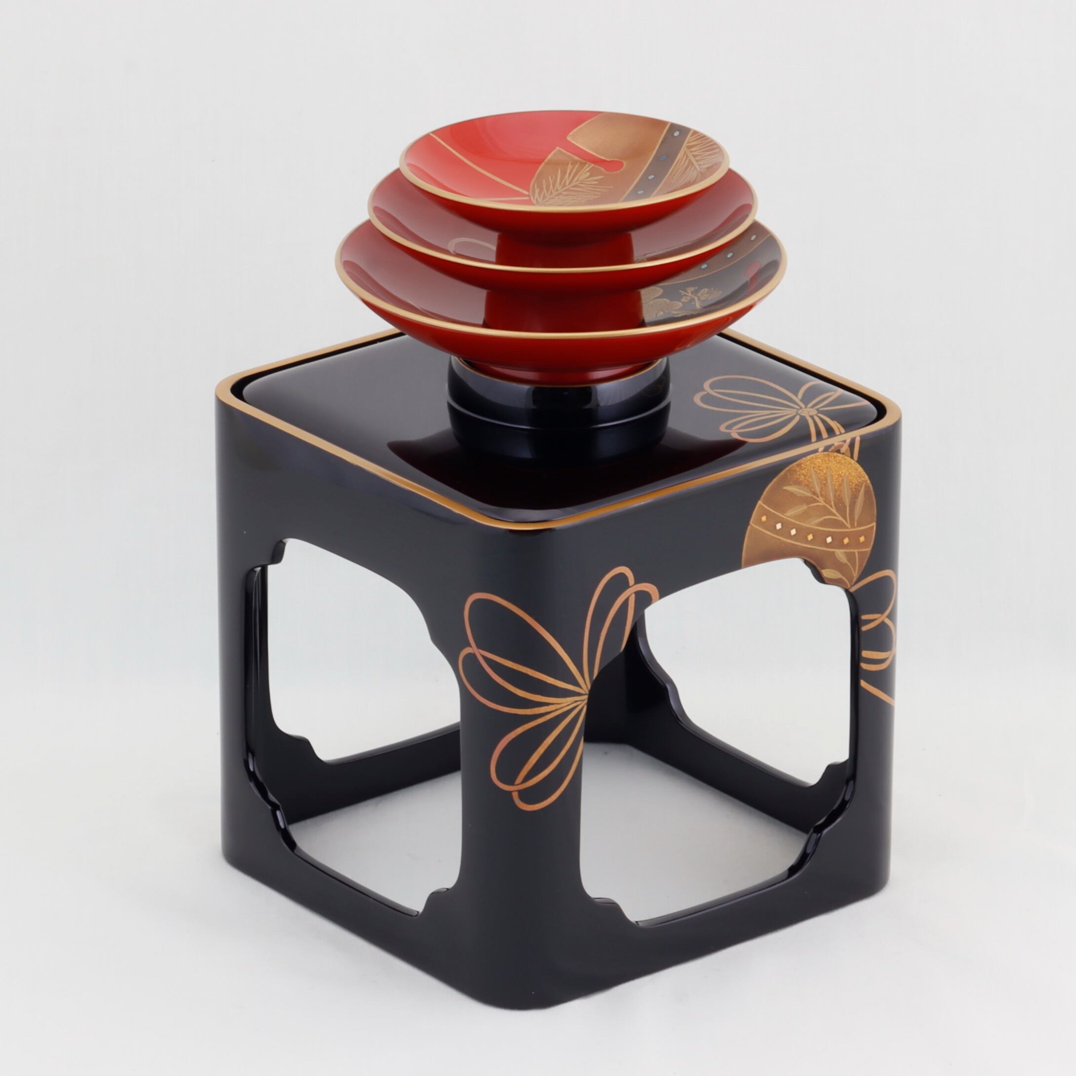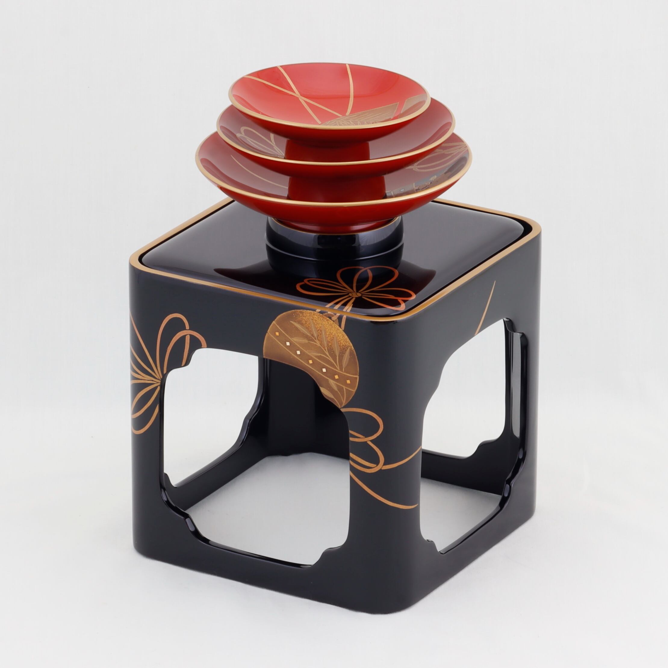 この屠蘇器は、廻足形の優雅なフォルムと、福鈴をあしらった美しい蒔絵が特徴です。特別な行事を華やかに演出するアイテムとして、際立った存在感を放ちます。