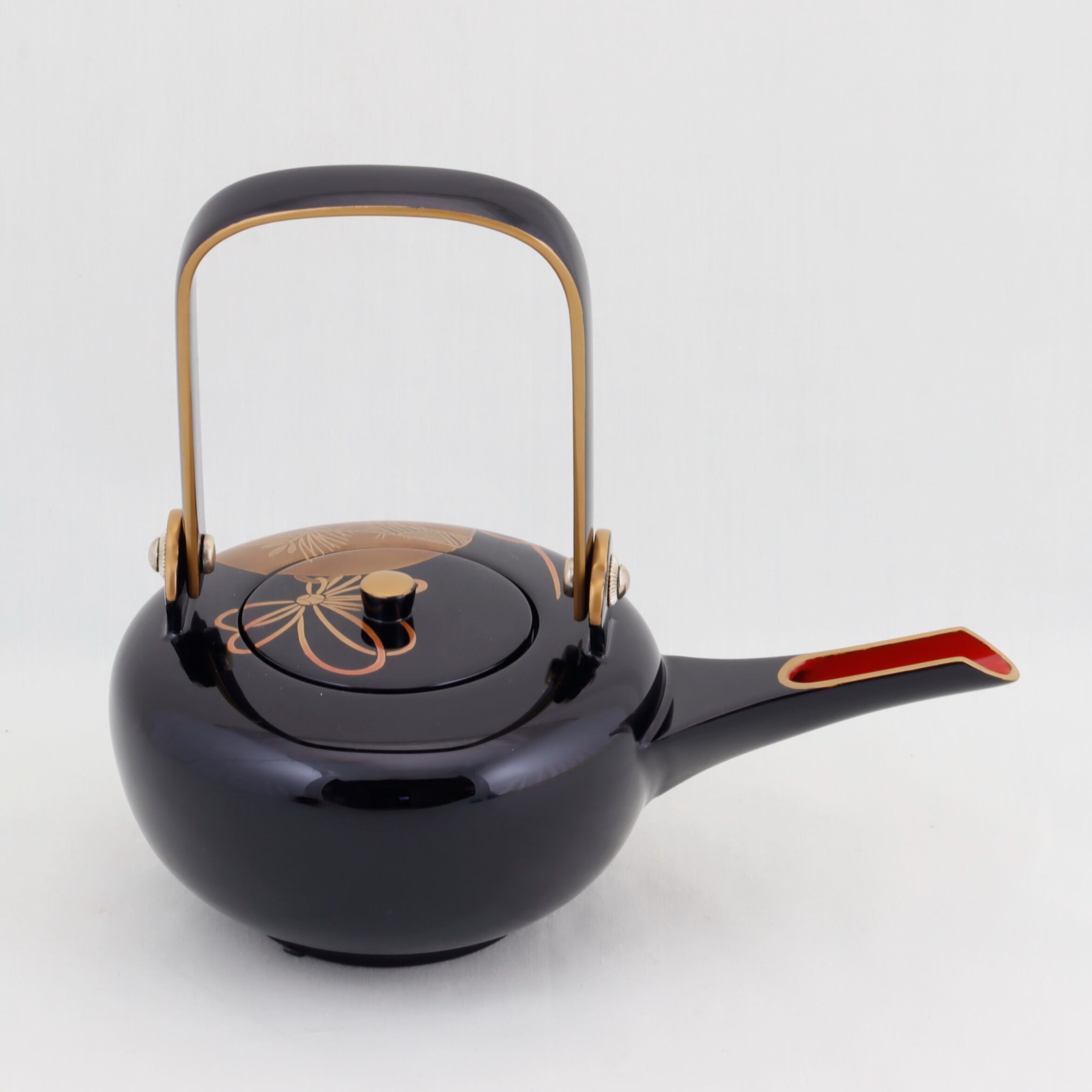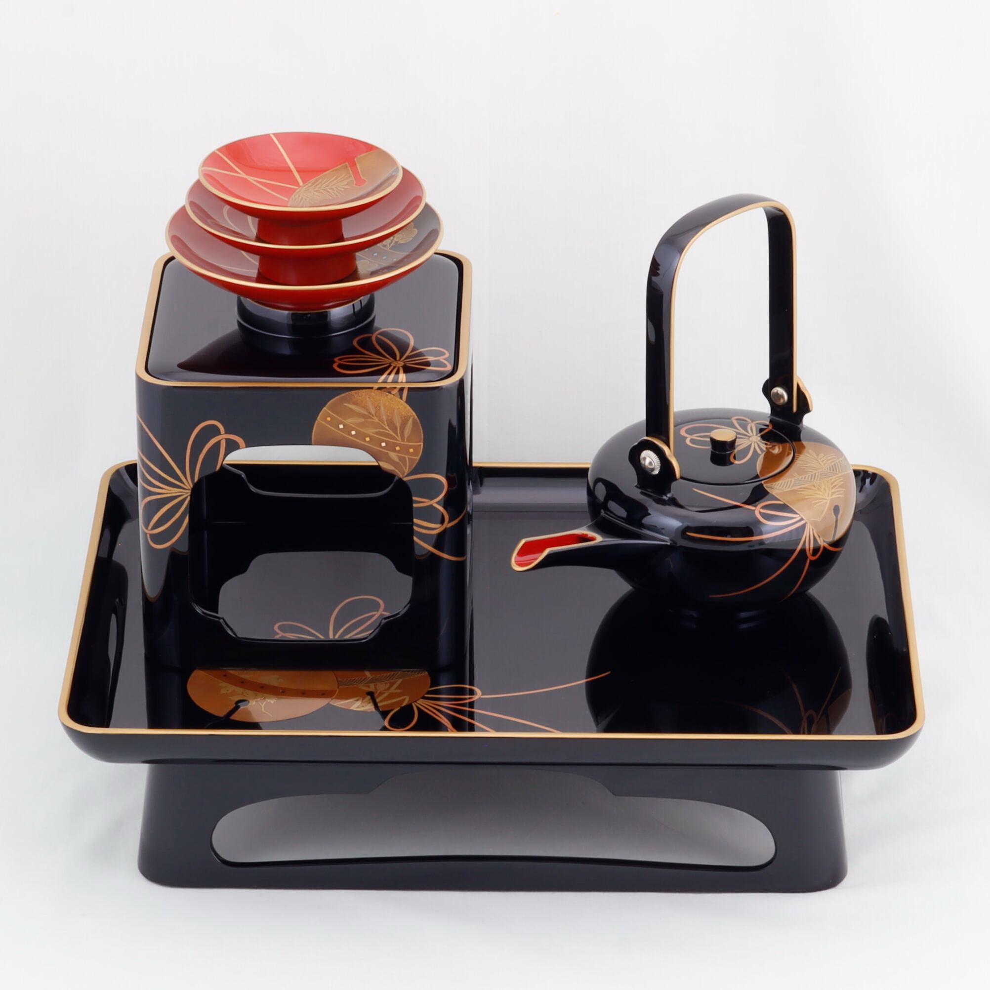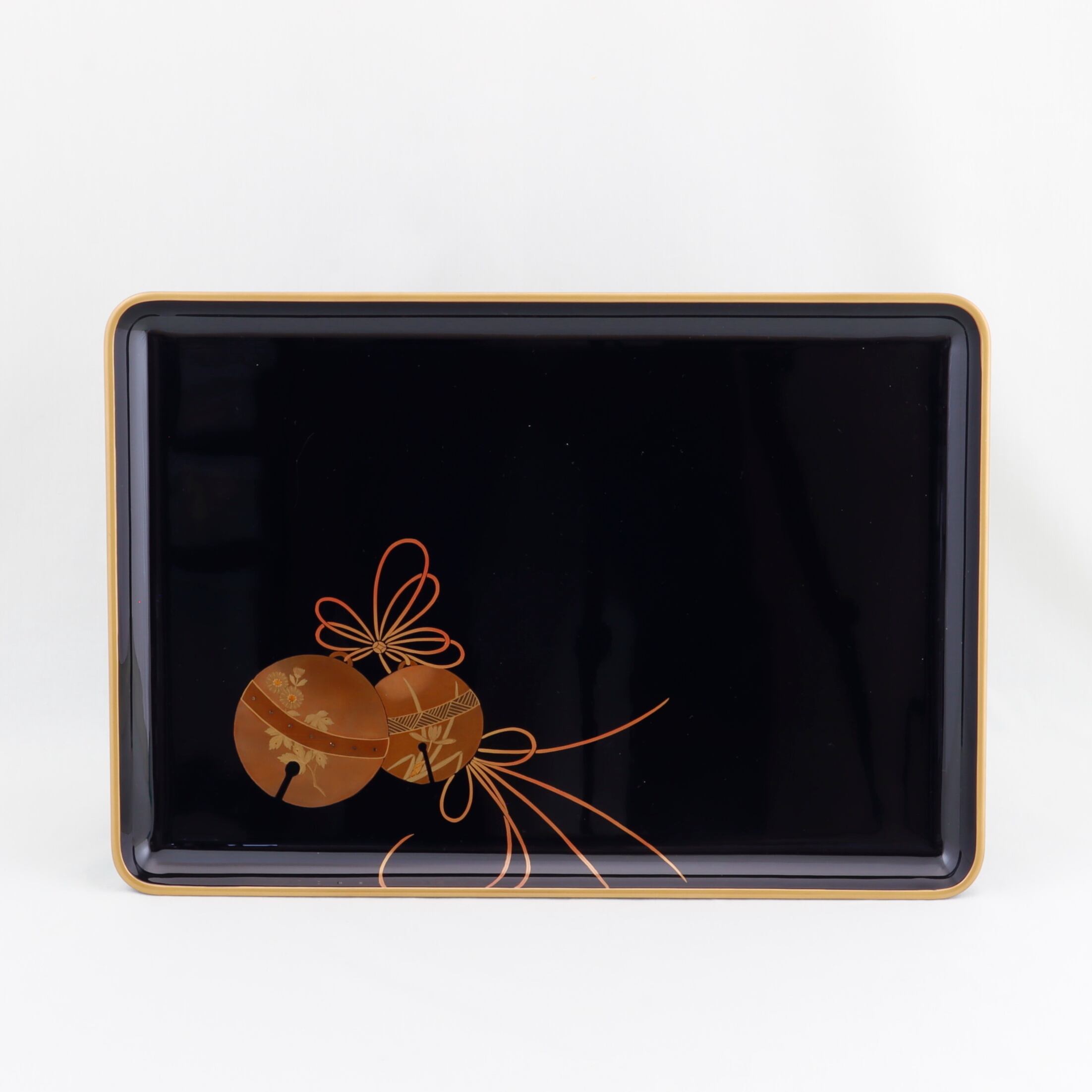 この屠蘇器は、廻足形の優雅なフォルムと、福鈴をあしらった美しい蒔絵が特徴です。特別な行事を華やかに演出するアイテムとして、際立った存在感を放ちます。