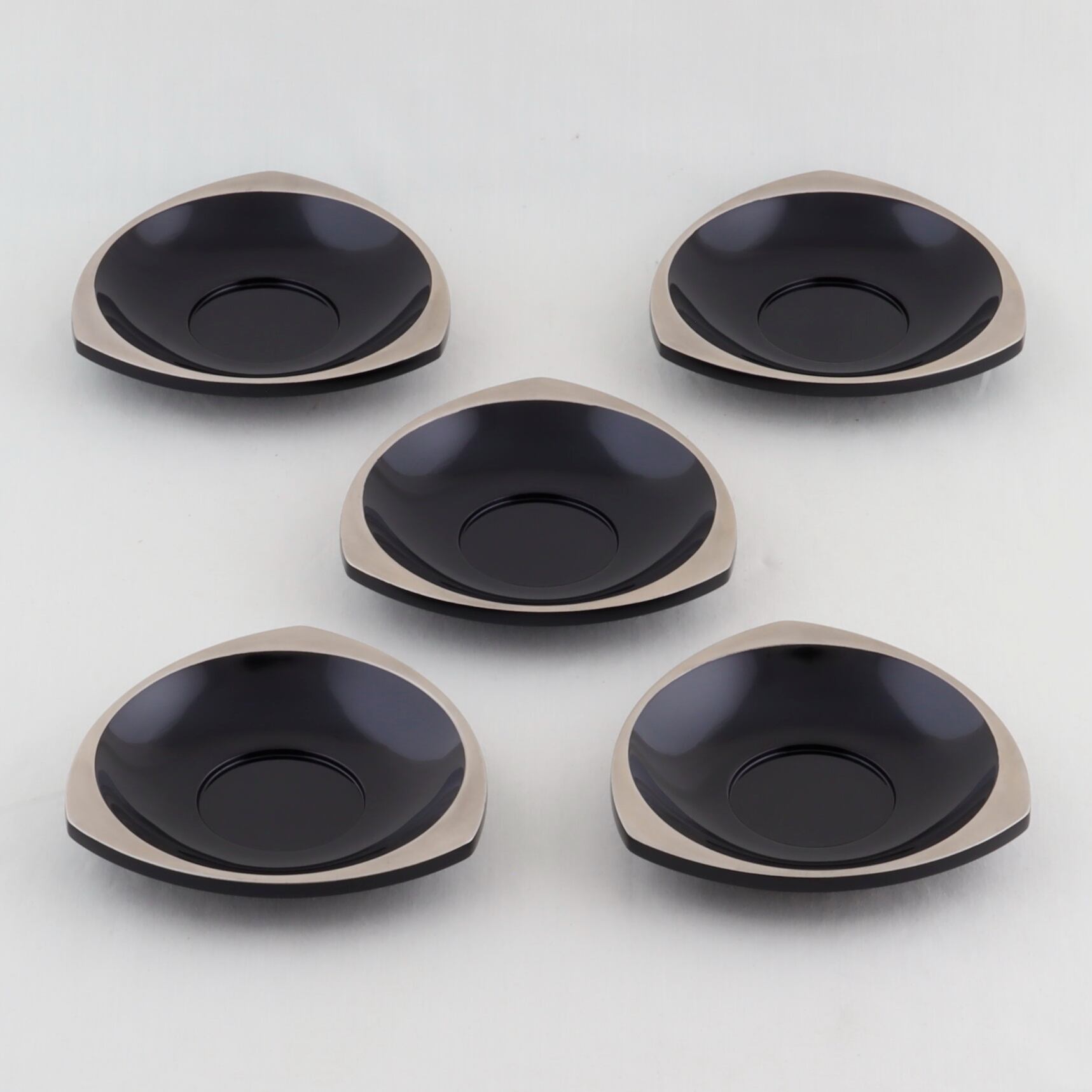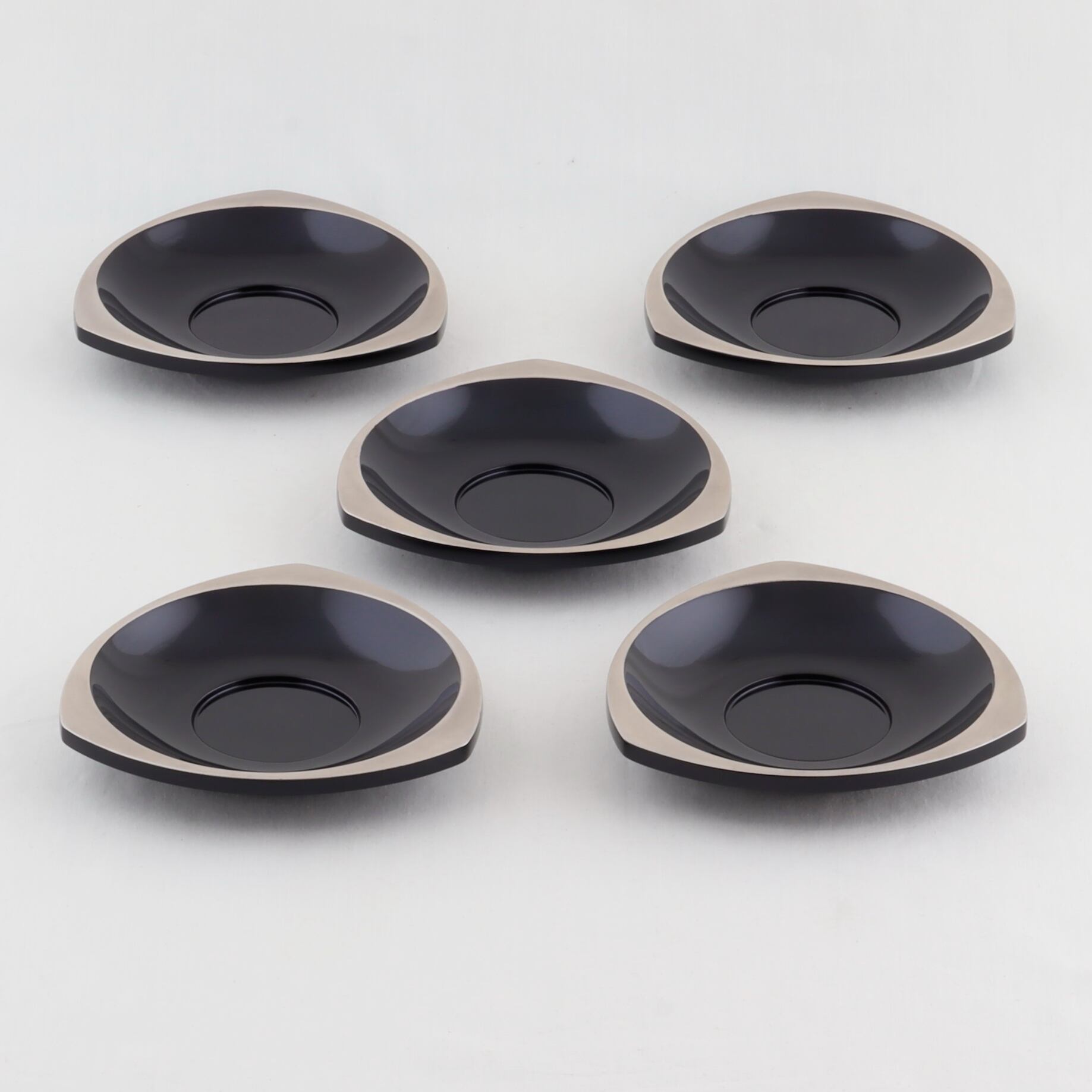この茶托は、三角形の美しい黒塗仕上げが特徴で、銀縁蒔絵が上品な輝きを添えています。日常のティータイムや特別な場面において、洗練された雰囲気を演出します。五枚セットなので、ご家族やお友達と共に楽しむティータイムにも大変便利です。