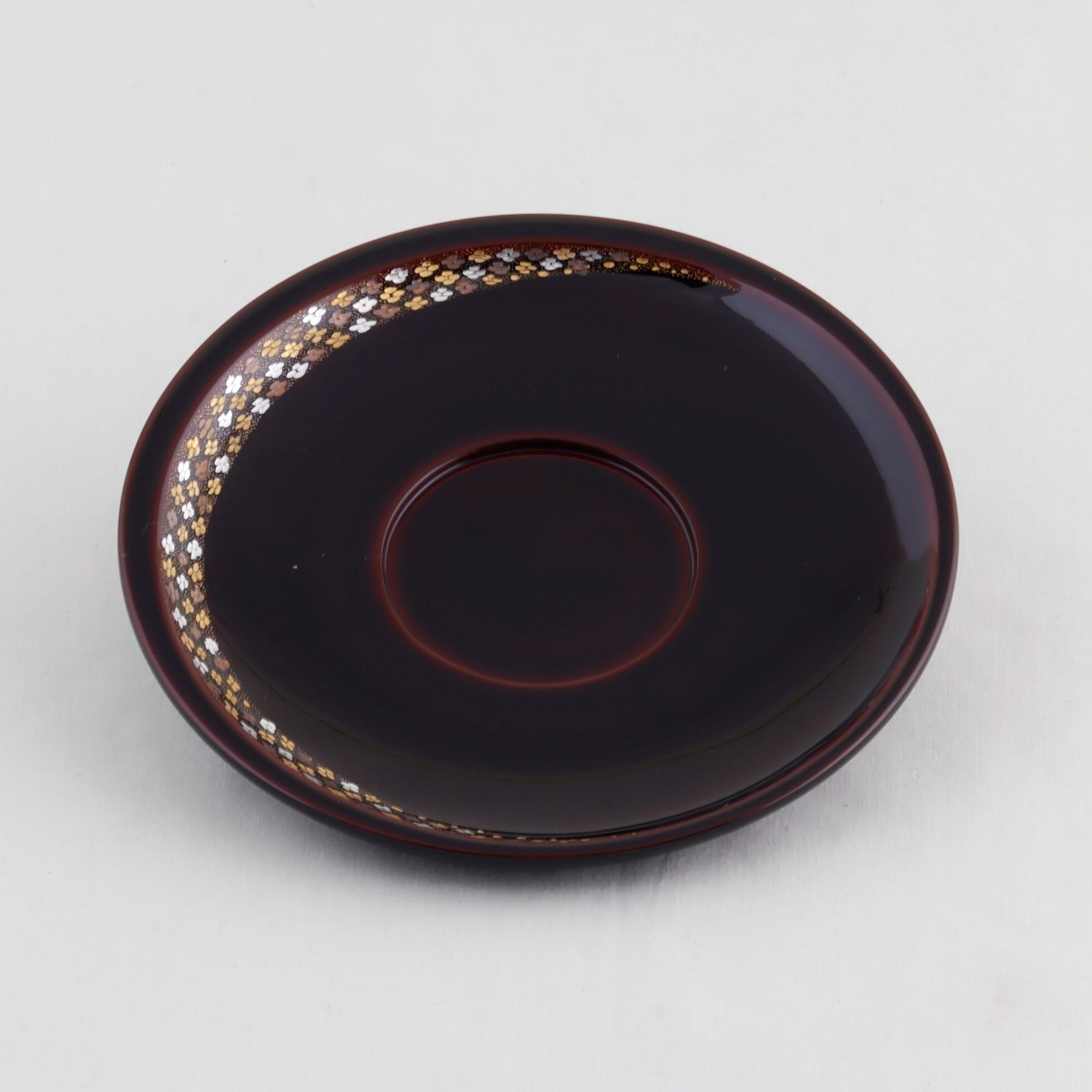 この茶托は、日月形の美しい溜塗仕上げが特徴で、小華沈金が上品な輝きを添えています。日常のティータイムや特別な場面において、洗練された雰囲気を演出します。五枚セットなので、ご家族やお友達と共に楽しむティータイムにも大変便利です。