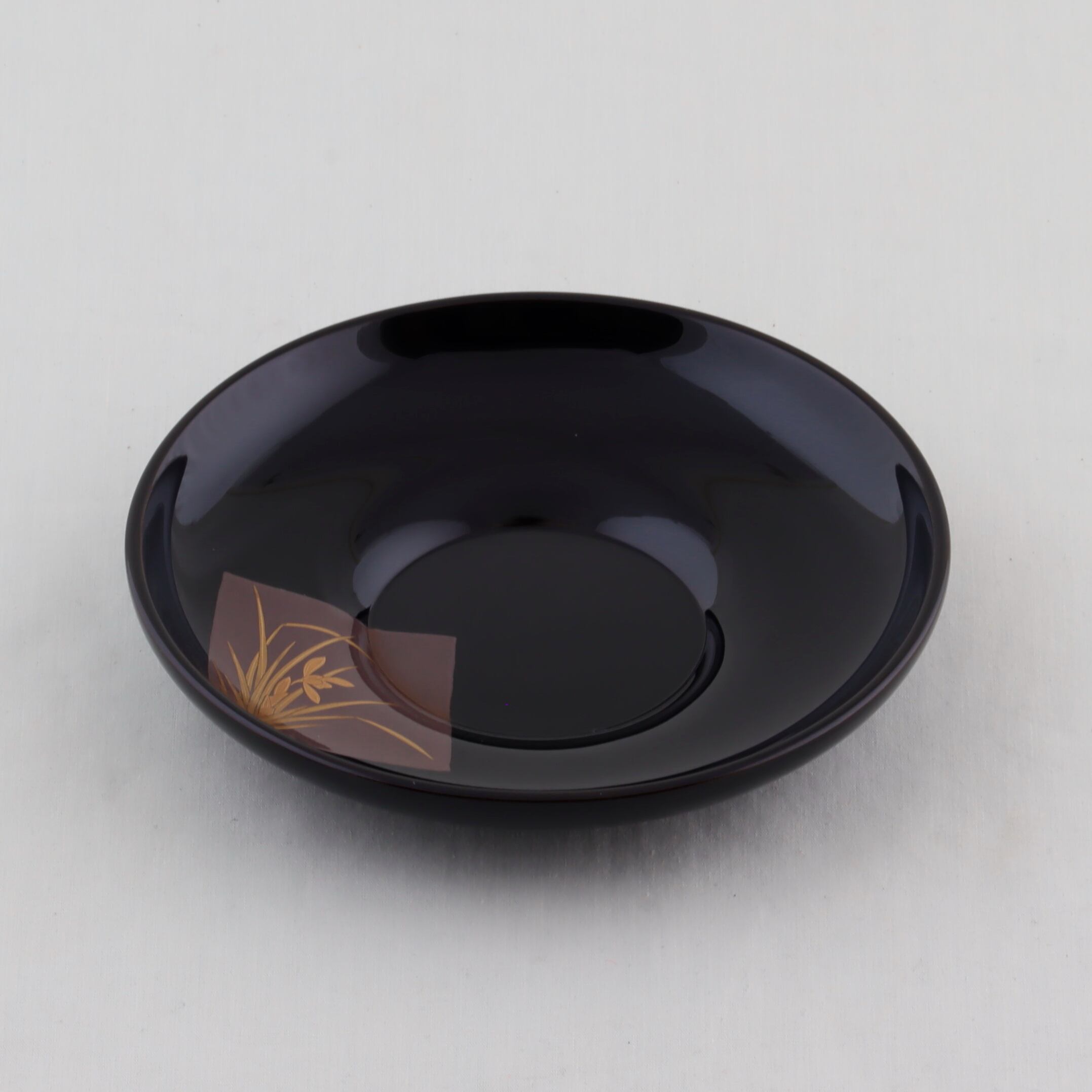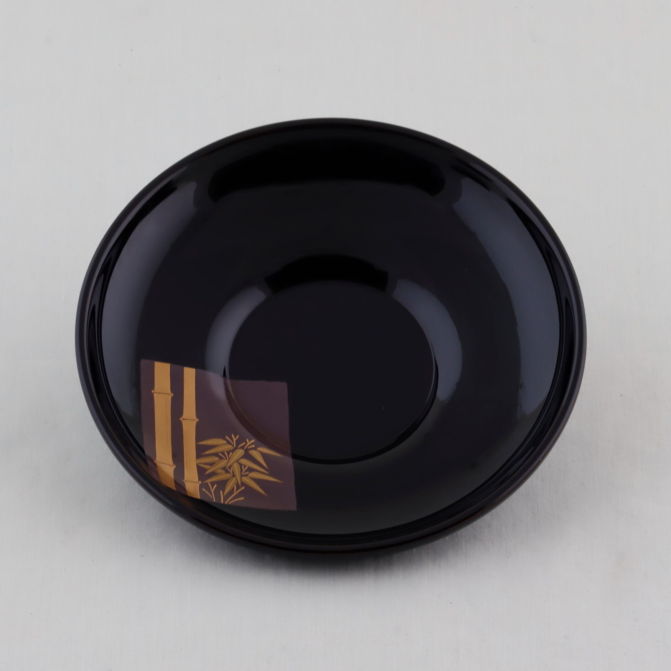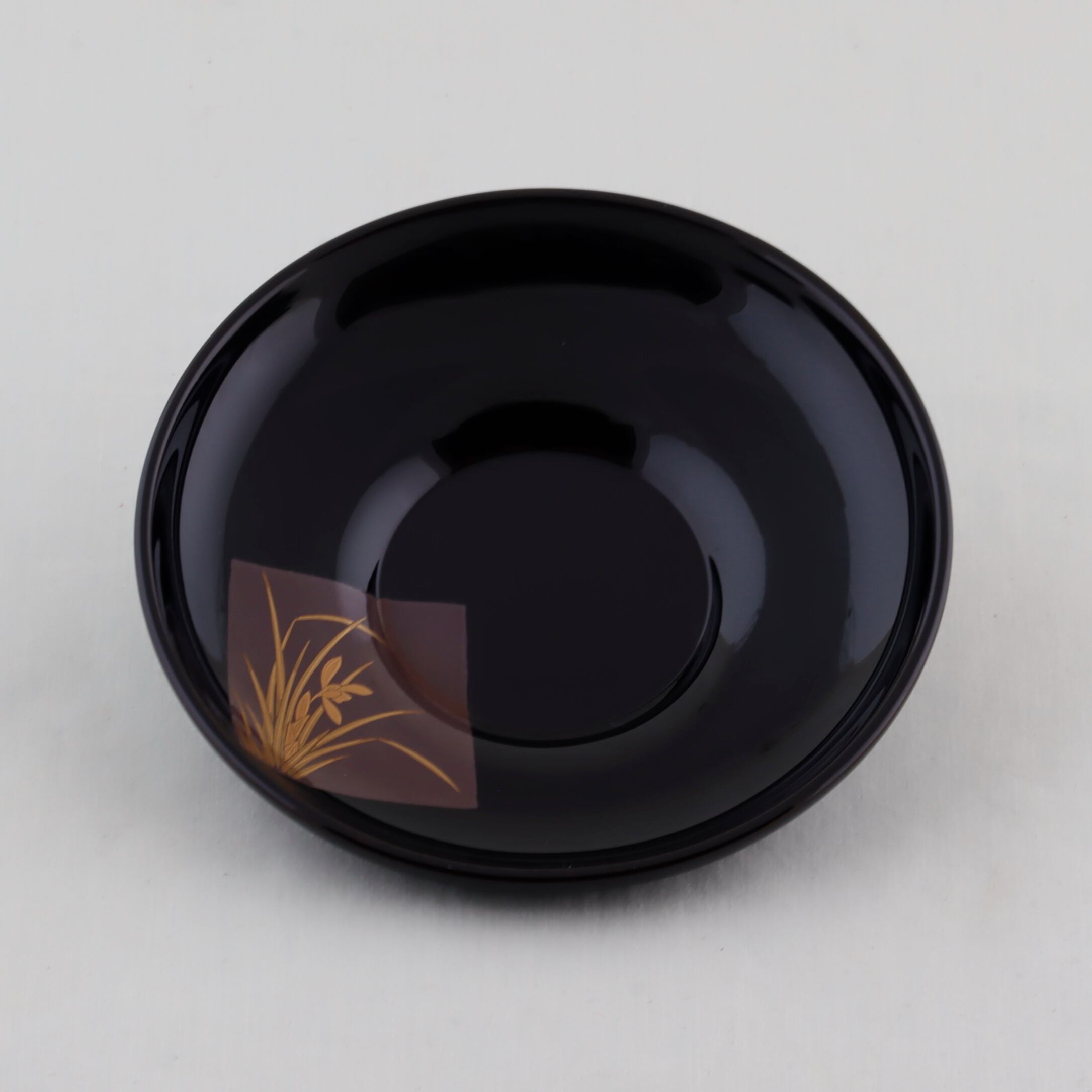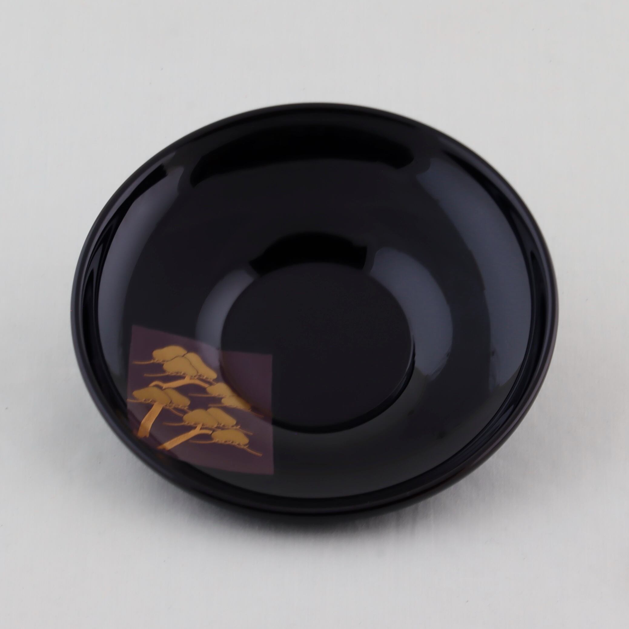この茶托は、ダルマ形の美しい黒塗に仕上げられ、草花をテーマにした繊細な蒔絵が上品な輝きを添えています。草花絵替わり蒔絵は、四季折々の美しさを表現しており、見る人の心を和ませるデザインです。色紙の内に五清の松、梅、竹、蘭、菊が描かれています。