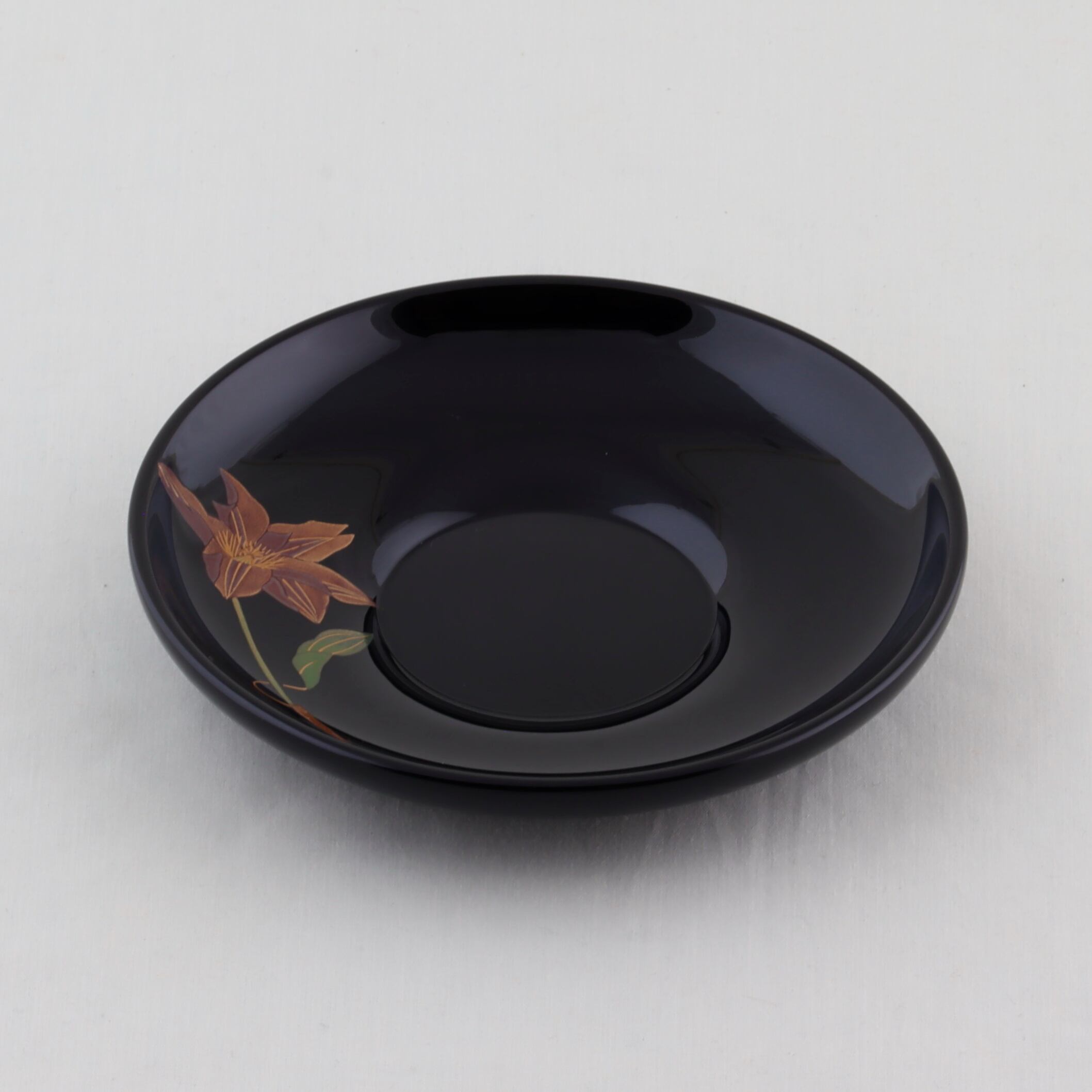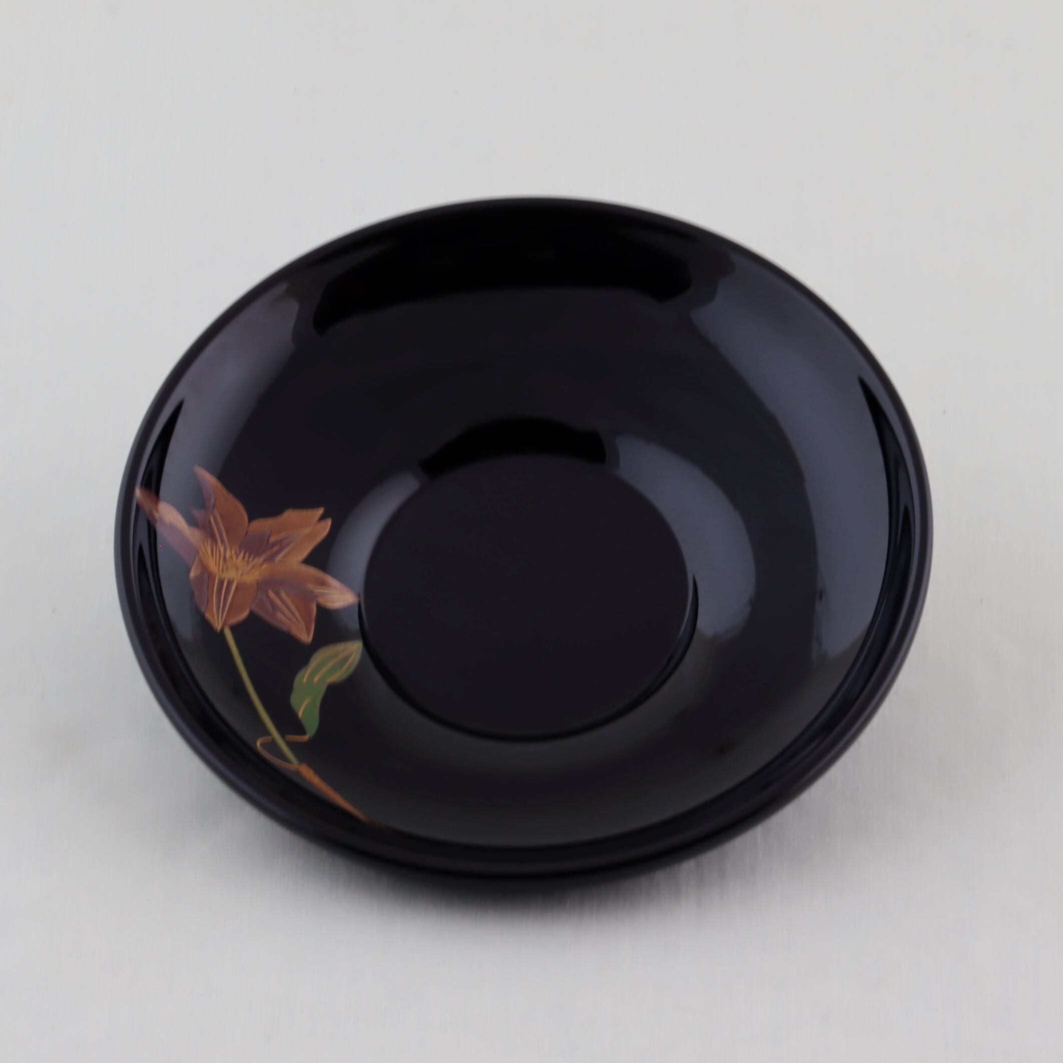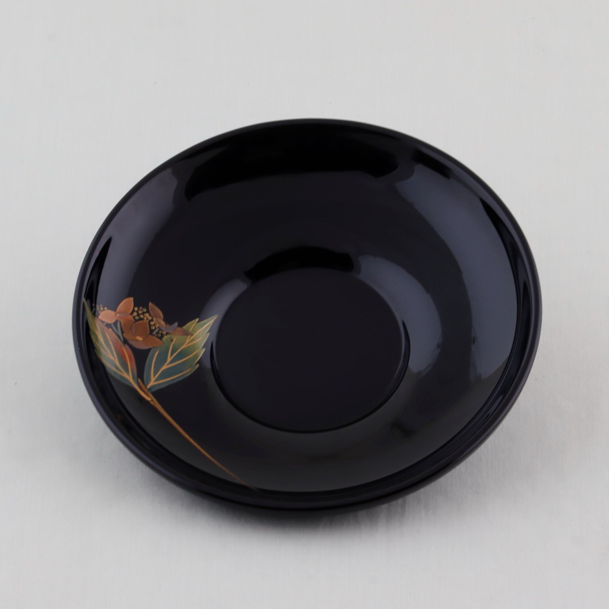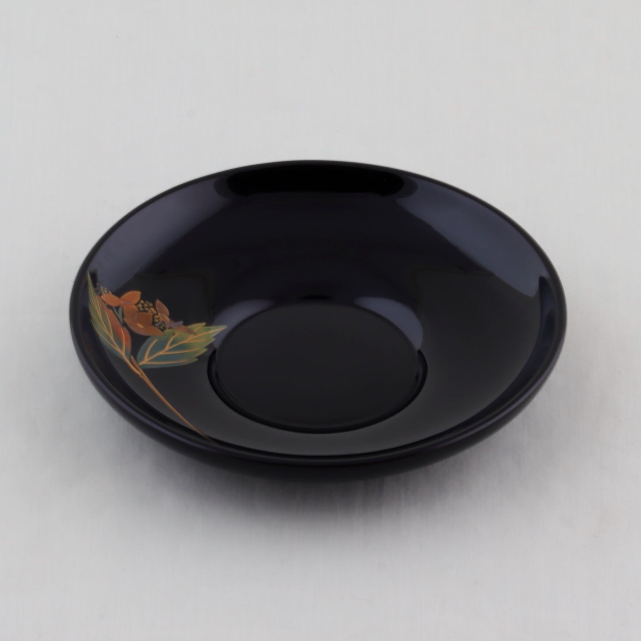 この茶托は、ダルマ形の美しい黒塗に仕上げられ、草花をテーマにした繊細な蒔絵が上品な輝きを添えています。草花絵替わり蒔絵は、四季折々の美しさを表現し、見る人に優しさと安らぎをもたらすデザインです。黒の深みは、食卓に落ち着きを与え、特別なひとときを演出します。絵替わり蒔絵、椿、鉄線、桜、紫陽花、紅葉が描かれています。