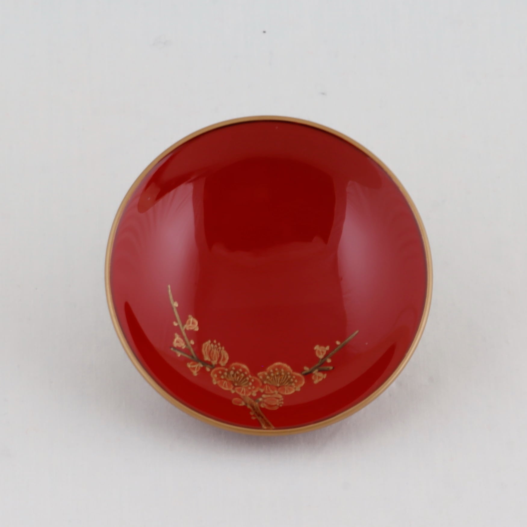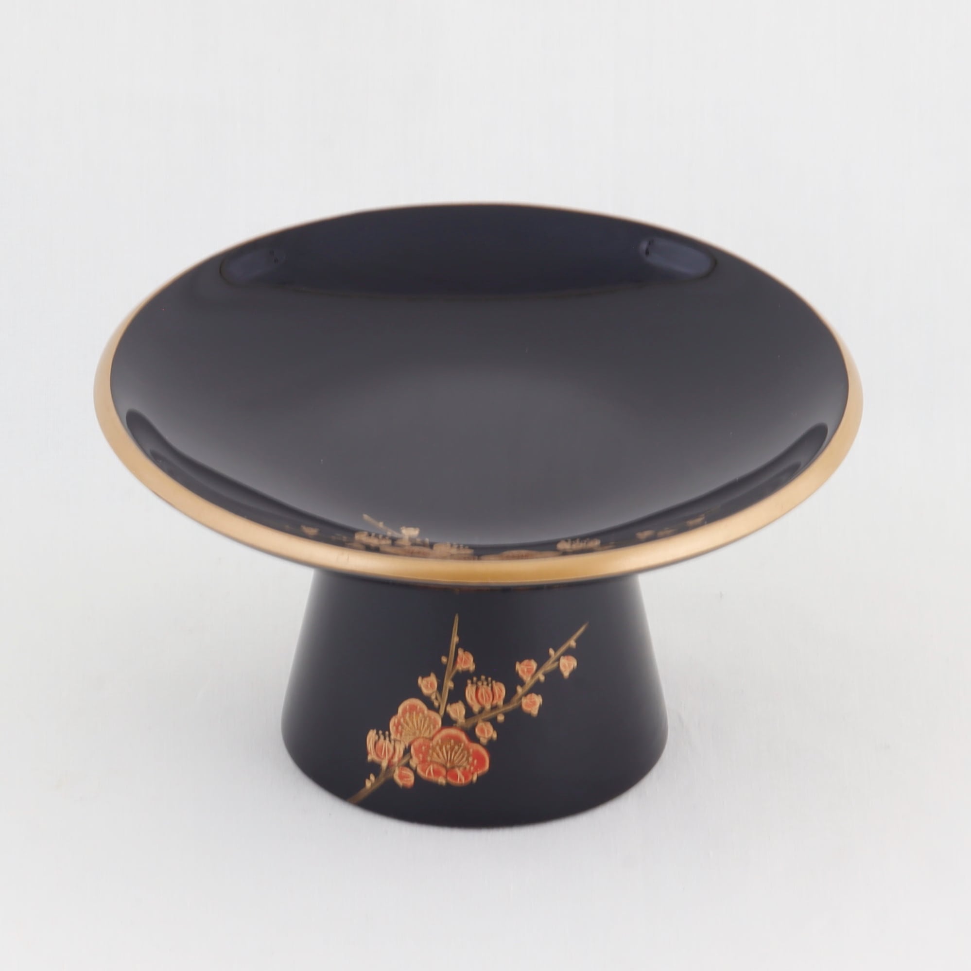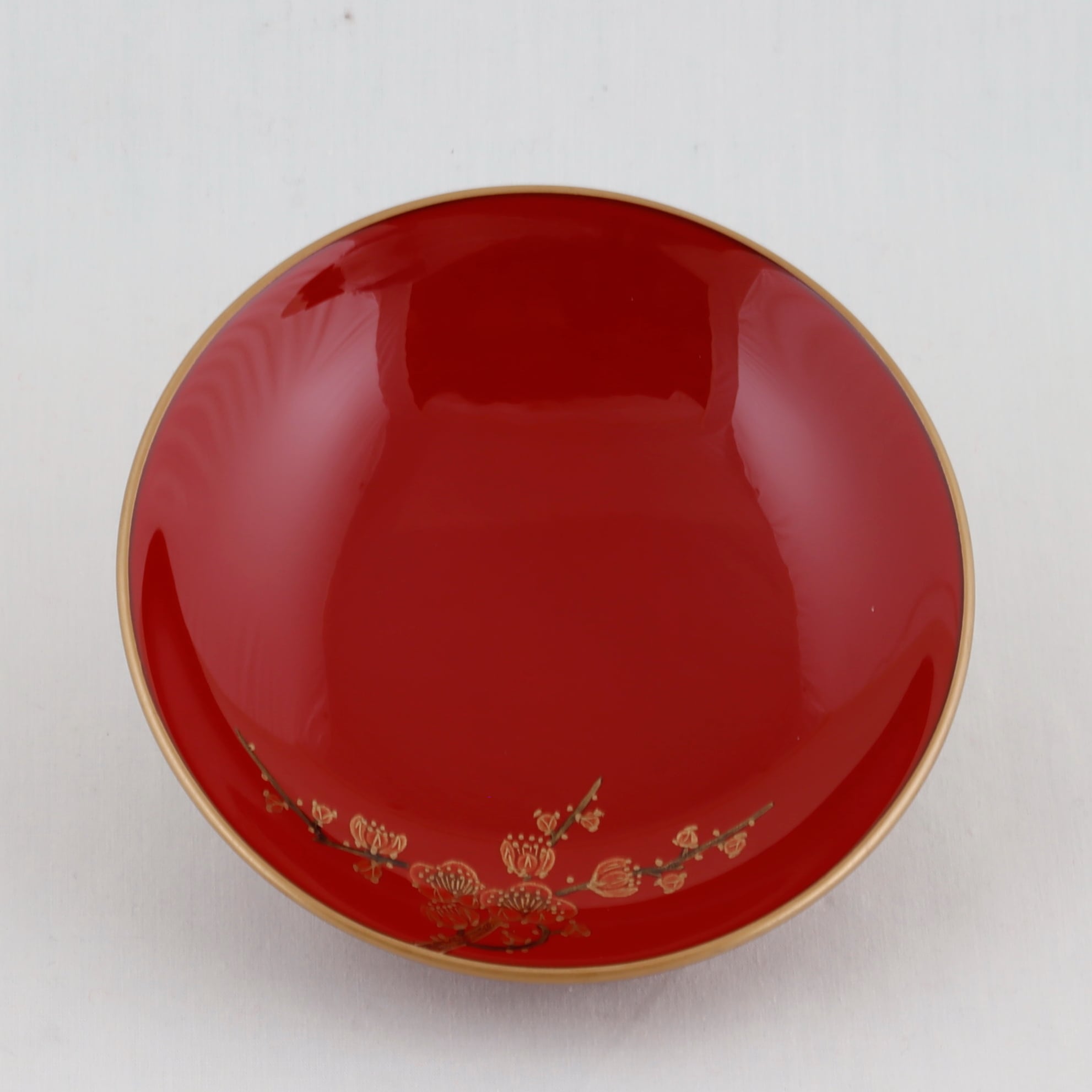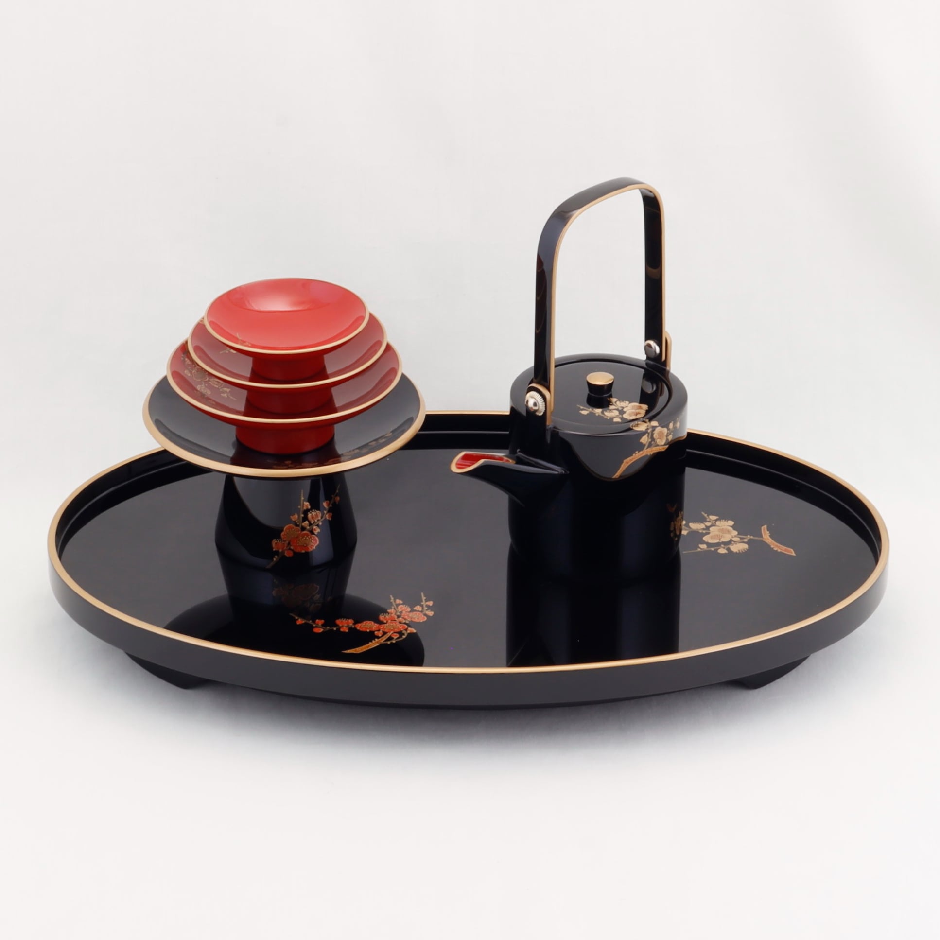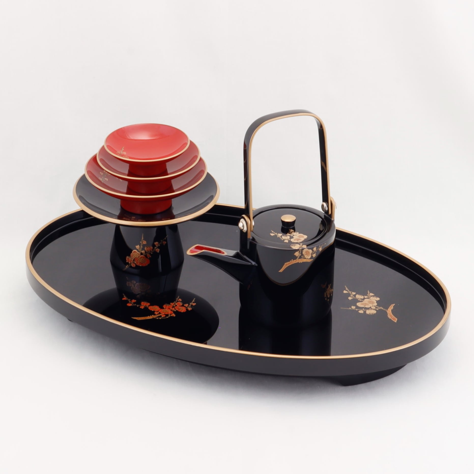 屠蘇台は小判形でテーブルの上で使えるよう足が低くなっています、盃台は丸形でシンプルな形、銚子は筒形で直線形、盃は三つ組(大、中、小)です。屠蘇器全体に紅白梅蒔絵が描かれています。迎春用品として、おもてなし用品としてお使いいただけます。