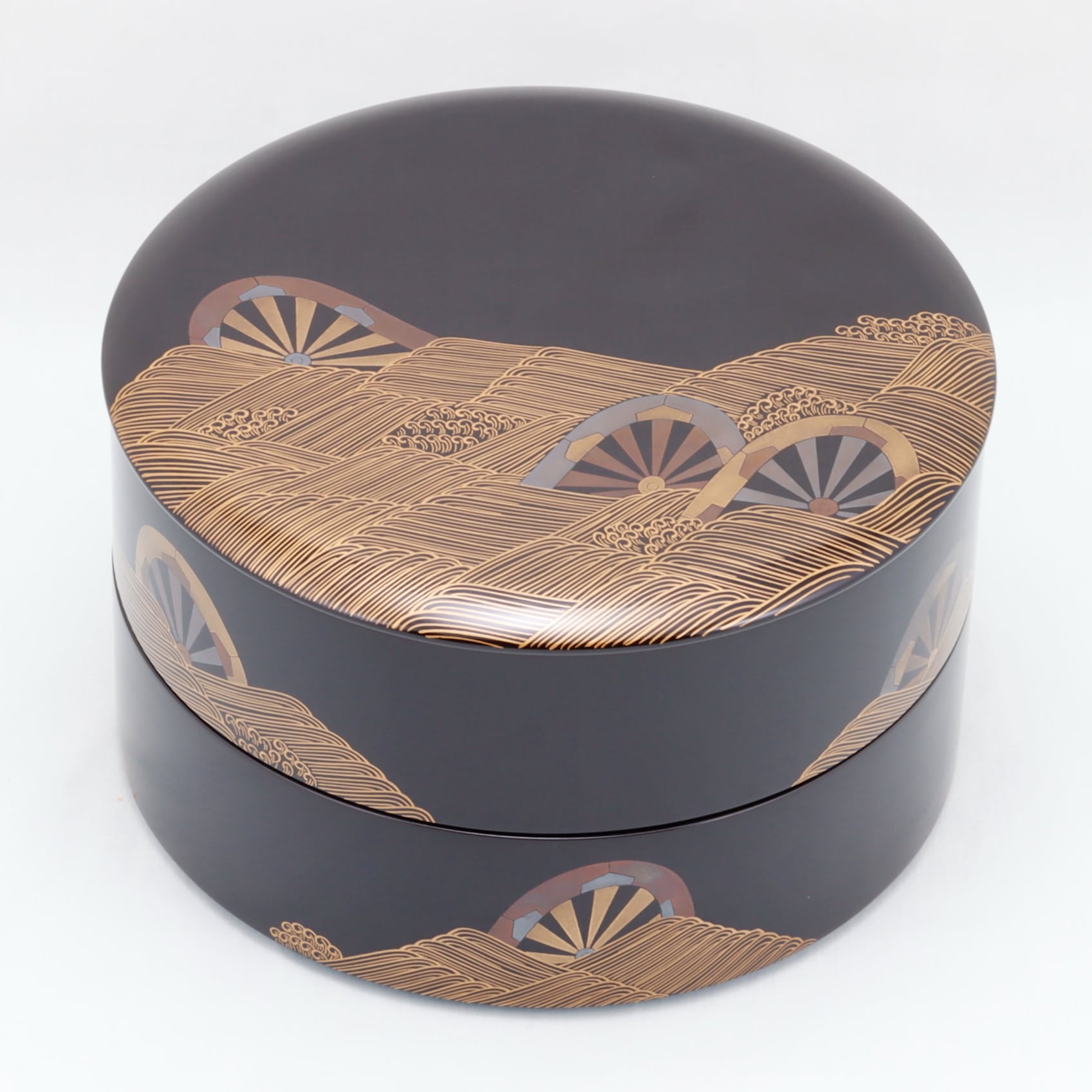 丸形の二段重です。外は黒塗で内は朱塗となっています。径は7寸8分と大きくたっぷりとお料理が入ります。お重の外側には「源氏車と波」が繊細な筆使いによる手仕事で描かれています。お重一段ごとにオードブル、寿司桶としても使えます。高級感と堅牢性、抗菌性が特徴です。