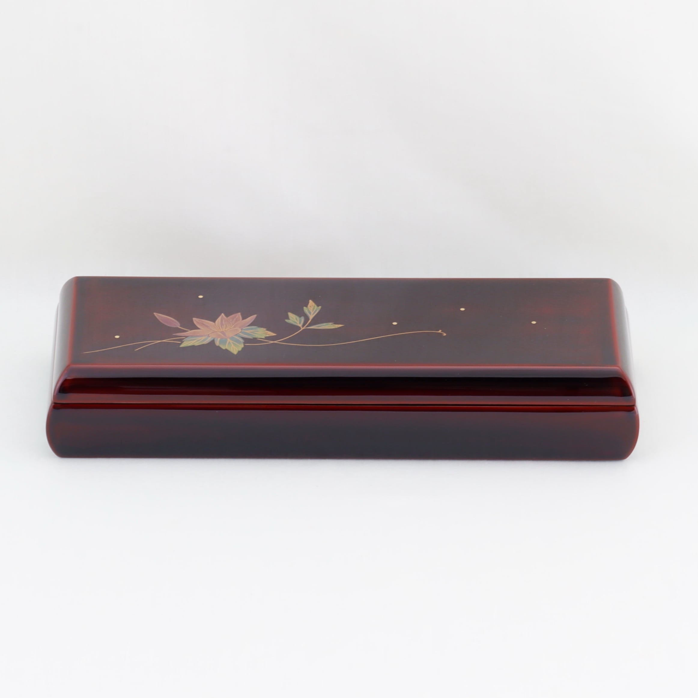 この卓上筆入りは、外溜塗、内白塗となっていて蓋を裏返すと印鑑や印肉などを置くこと出来ます。デスク上の万年筆や鉛筆また毛筆をなど様々な筆記用具を入れることが出来デスクの整理整頓に役立ちます。蒔絵は職人による緻密な筆使いで伝統的文様の「鉄線蒔絵」が描かれていています。
