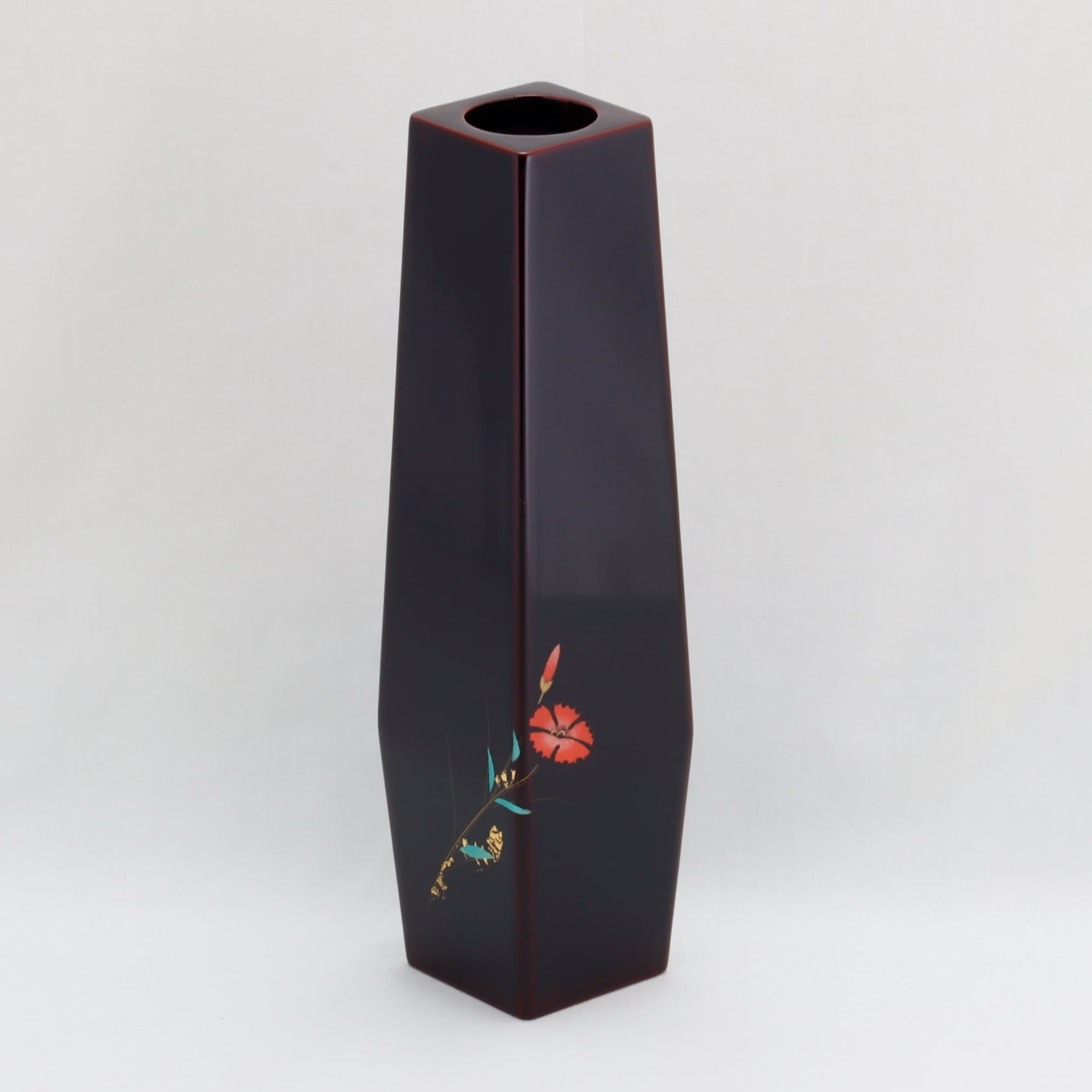 繊細な美しさが広がる、輪島塗の花器です。溜塗に撫子の沈金が施された角胴張形のデザインは、和の美を際立たせます。花器に活けた花々が引き立つこと間違いなしです。