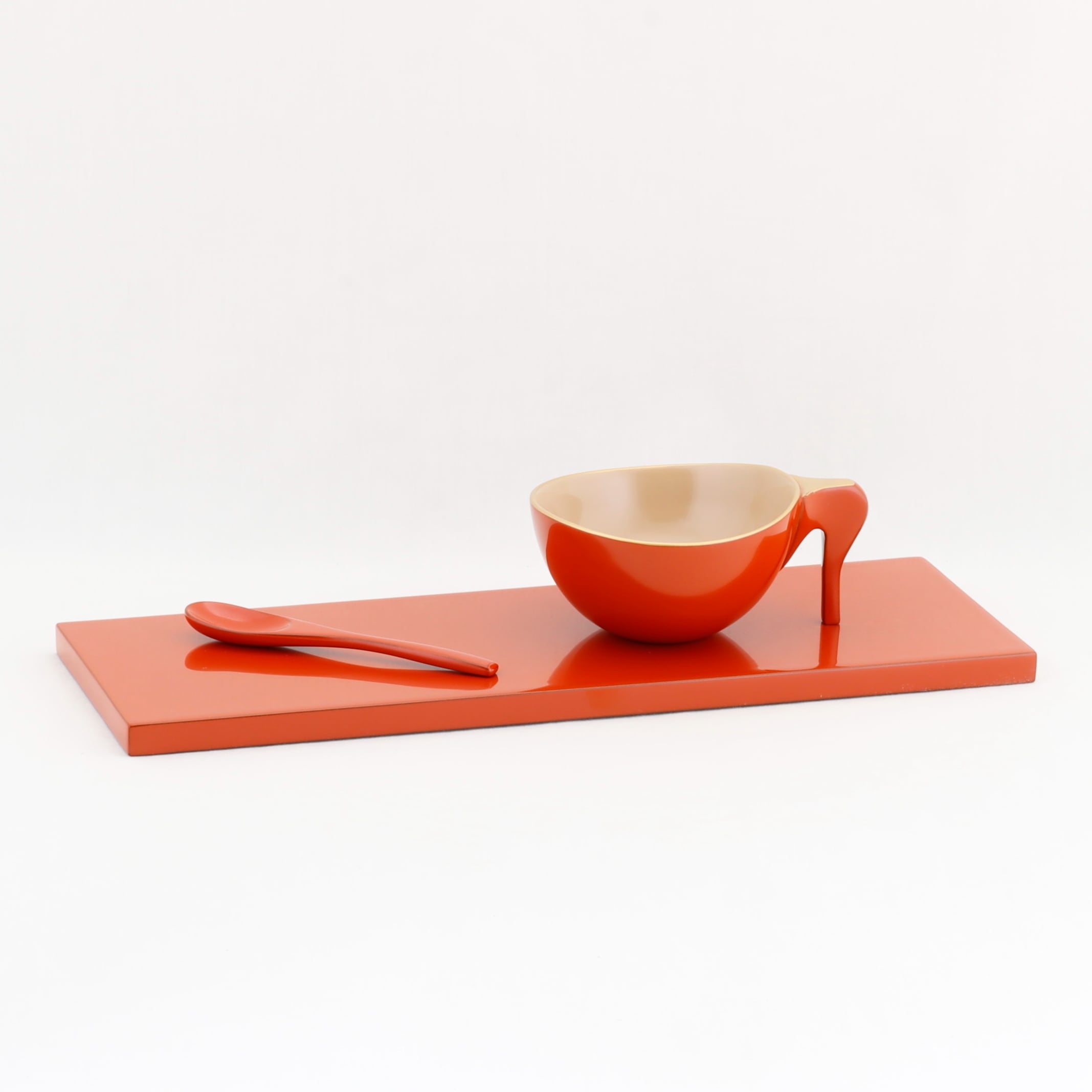 輪島塗、ペア珈琲カップはハイヒールをイメージしたカップです。木製で保温性に富み珈琲を温かく保ち、軽るいのが特徴です。またコーヒーの色が楽しめる内白塗となっており、ソーサーは長方形が付いています。ソーサーは菓子皿としてもお使いいただけるようになっています。