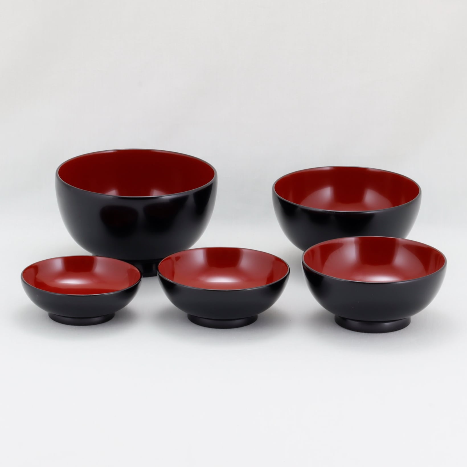黒内朱塗で仕上げられたこの五ッ組椀は、スタイリッシュなデザインが特徴で、様々なお料理に合わせてお使いいただけます。大小様々な椀が揃っているため、一汁三菜やおかずの盛り付けなど、料理の楽しみを広げてくれます。また収納時にはスペースを要しないことも特徴です。